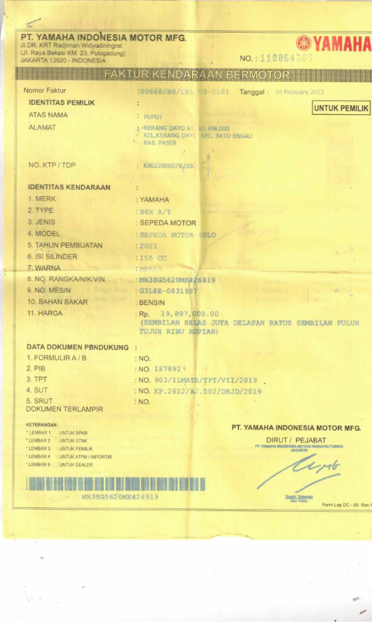 | No. Rangka | : | MH3SG5620MK426919 |