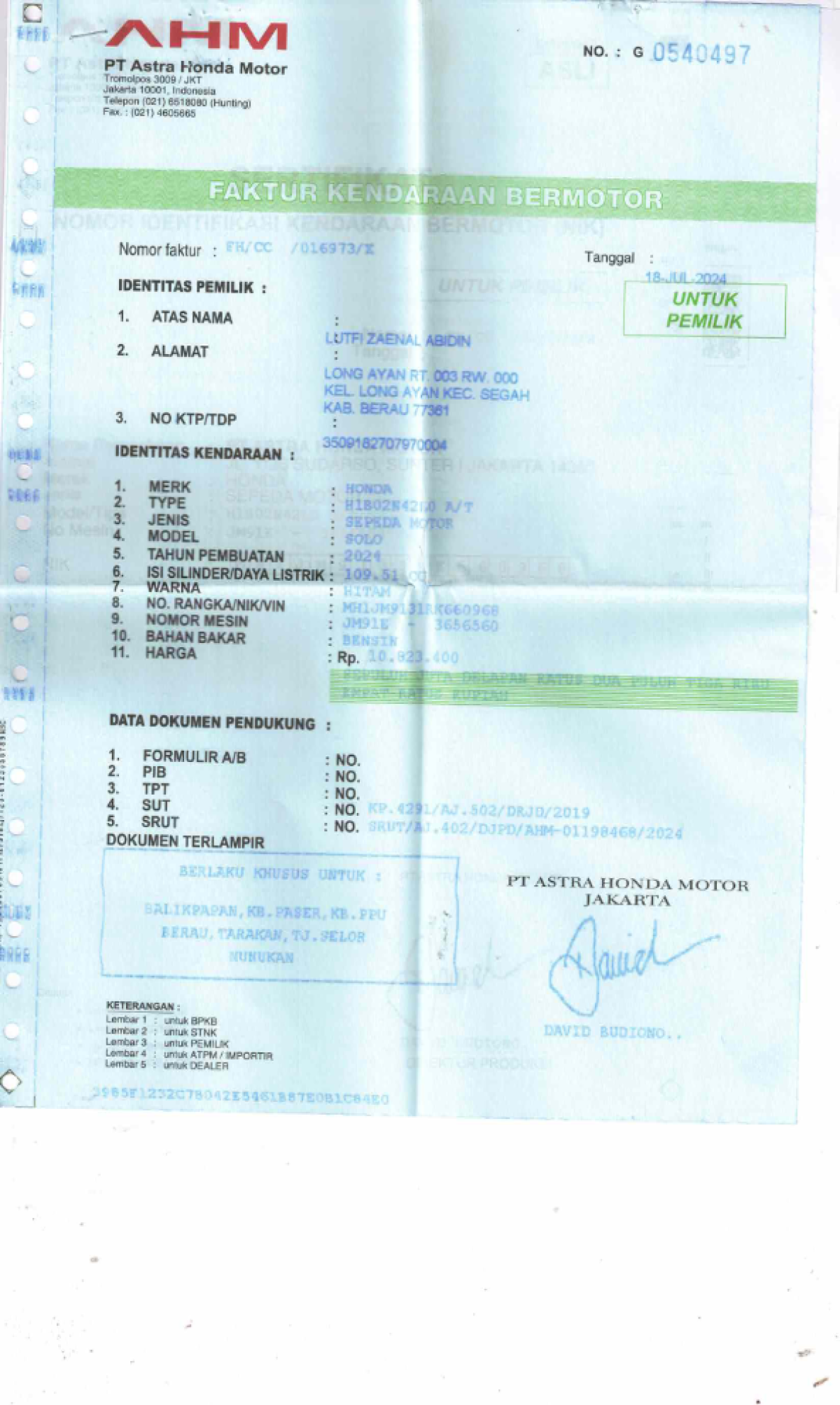 | No. Rangka | : | MH1JM9131RK660968 |