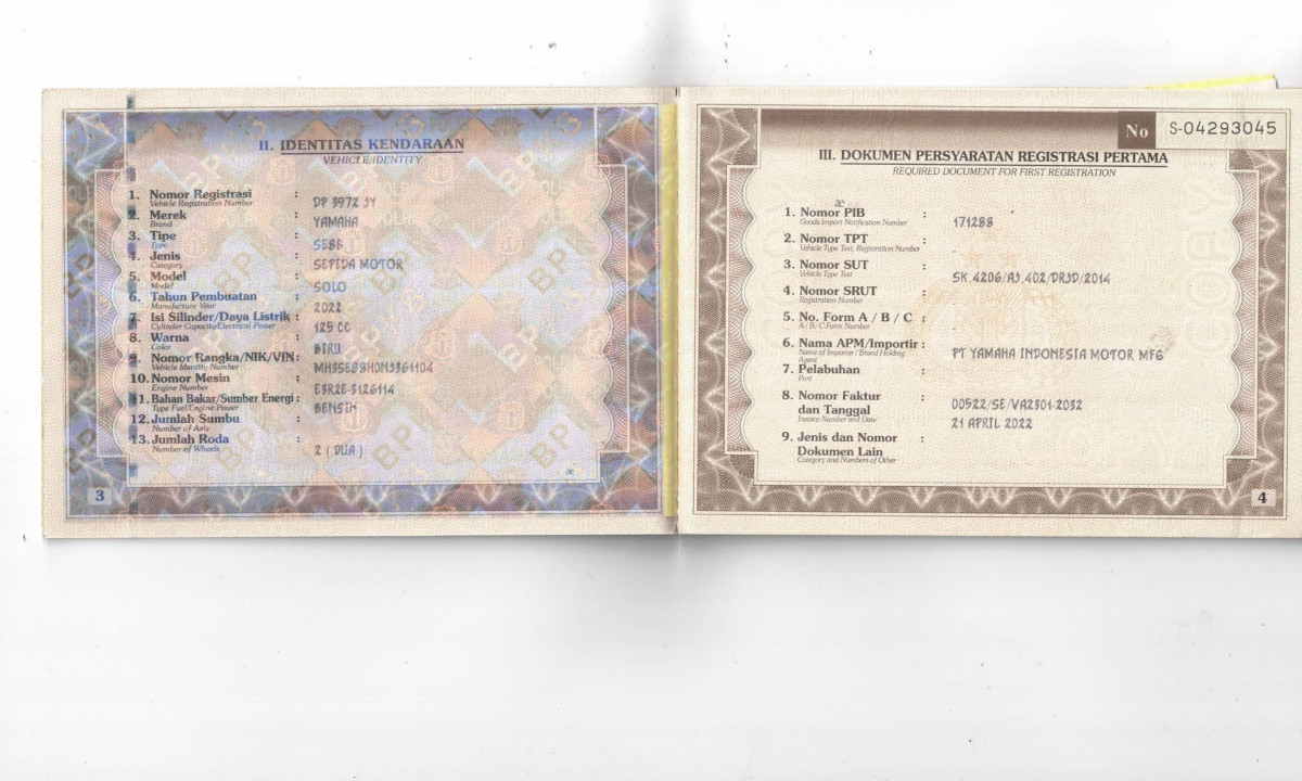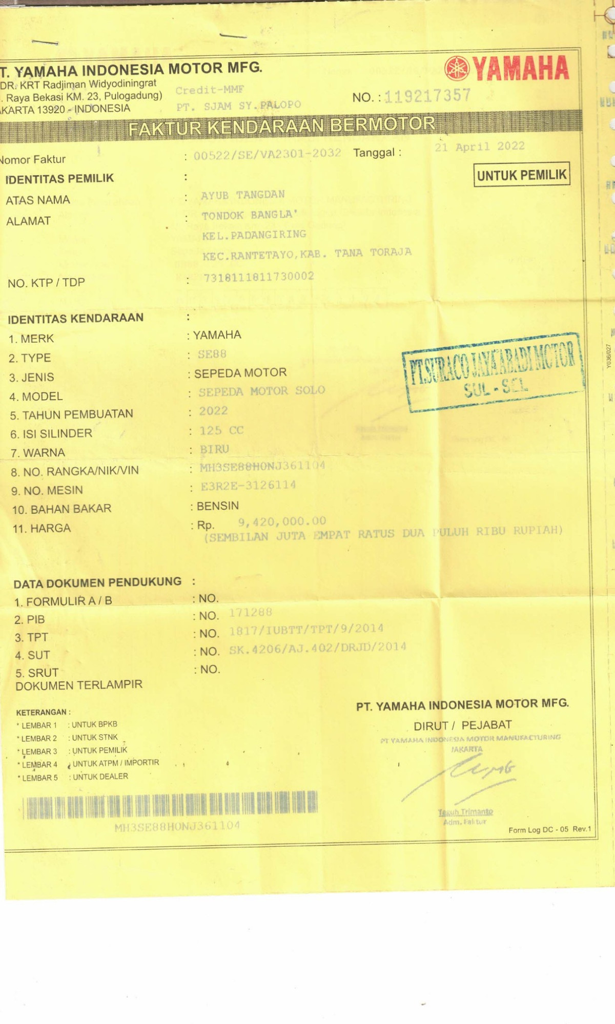 | No. Rangka | : | MH3SE88H0NJ361104 |