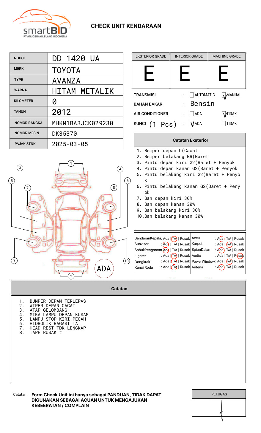 SEBELUM MELAKUKAN PENAWARAN UNIT PESERTA LELANG WAJIB MELAKUKAN PENGECEKAN UNIT DAN DOKUMEN TERLEBIH DAHULU // PIC RUDAL 0859-3010-9135 / MUHAMMAD DARWIS 082348587430 // NOPOL FISIK TA //