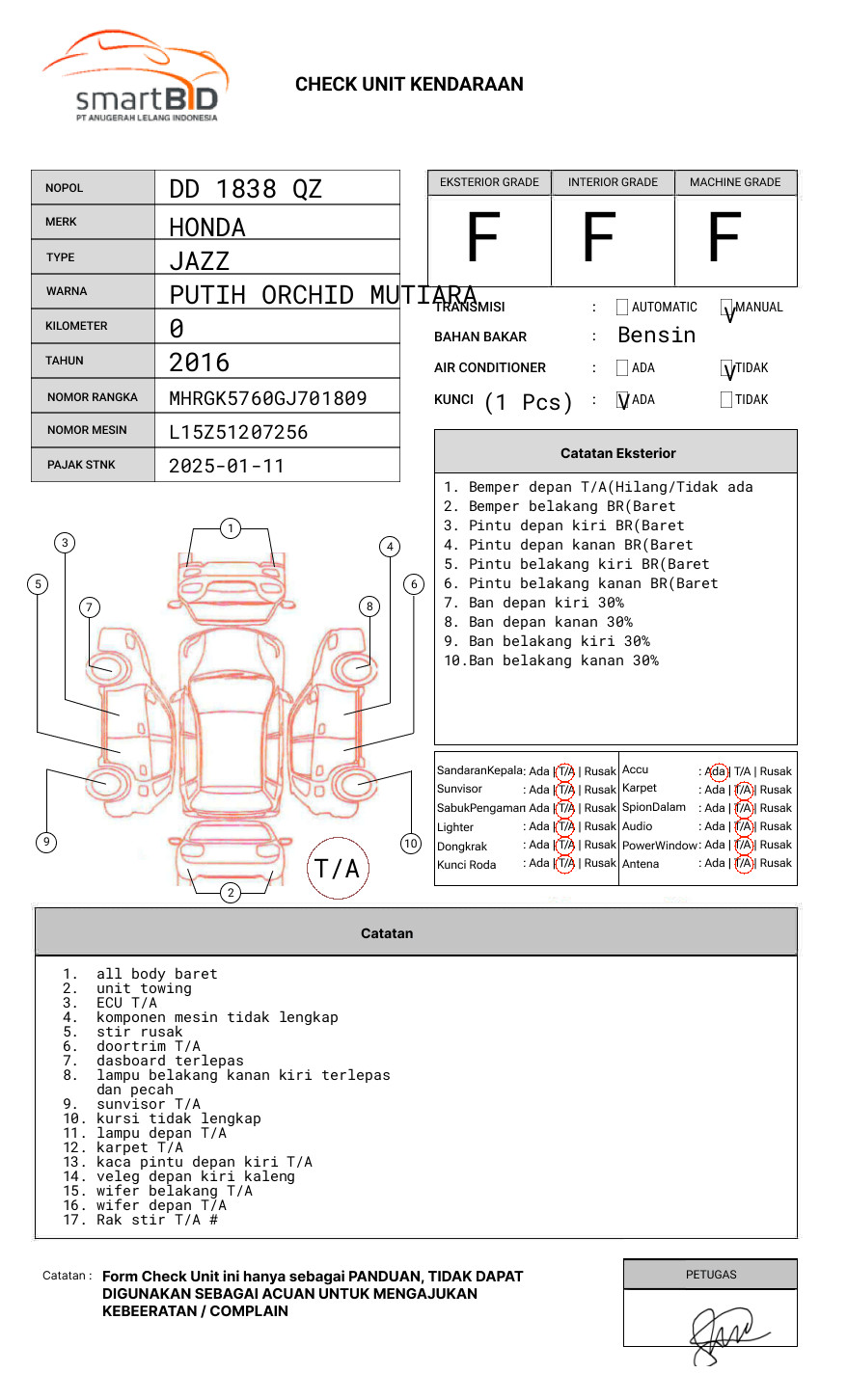 NOPOL FISIK T/A // SEBELUM MELAKUKAN PENAWARAN UNIT PESERTA LELANG WAJIB MELAKUKAN PENGECEKAN UNIT DAN DOKUMEN TERLEBIH DAHULU // PIC LULU +62 856-5712-5589//UNIT DIKENAKAN BIAYA PPN 1.1% DARI HARGA TERBENTUK //