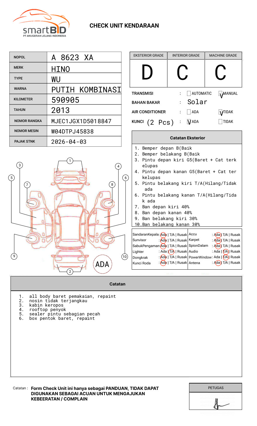 SEBELUM MELAKUKAN PENAWARAN UNIT PESERTA LELANG WAJIB MELAKUKAN PENGECEKAN UNIT DAN DOKUMEN TERLEBIH DAHULU // PIC WAHYU : 082124062748// BEBERAPADIGIT NOSIN FISIK TIDAK TERJANGKAU (TERHALANG)