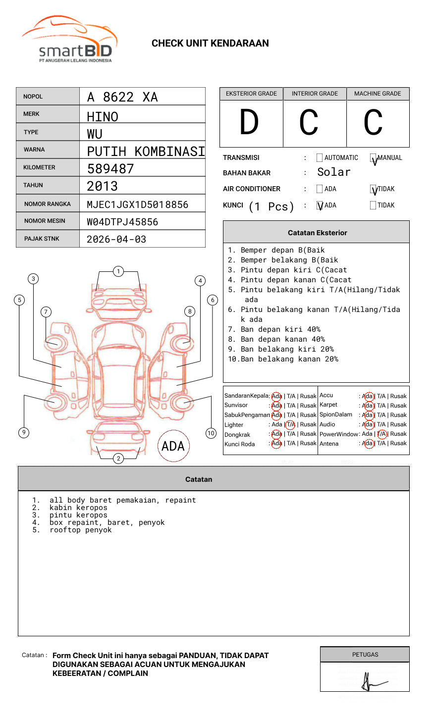 SEBELUM MELAKUKAN PENAWARAN UNIT PESERTA LELANG WAJIB MELAKUKAN PENGECEKAN UNIT DAN DOKUMEN TERLEBIH DAHULU // BEBERAPA DIGIT NOSIN FISIK TIDAK TERJANGKAU (TERHALANG)// PIC WAHYU : 082124062748//