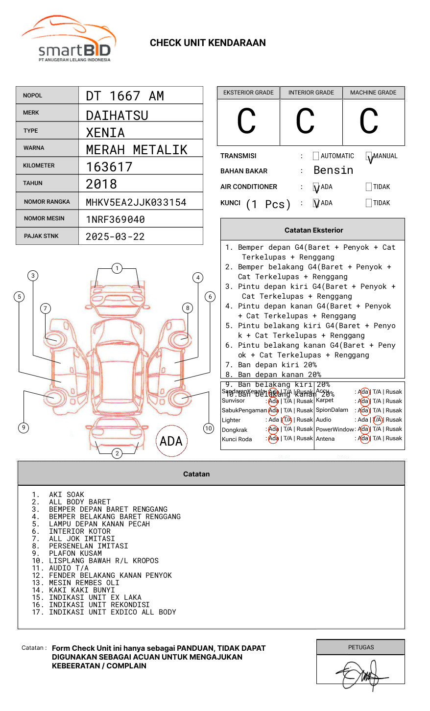 SEBELUM MELAKUKAN PENAWARAN UNIT PESERTA LELANG WAJIB MELAKUKAN PENGECEKAN UNIT DAN DOKUMEN TERLEBIH DAHULU // PIC AHMAD 082345278181 IKRAM 085241587738 // UNIT DIKENAKAN BIAYA PPN 1.1% DARI HARGA TERBENTUK //