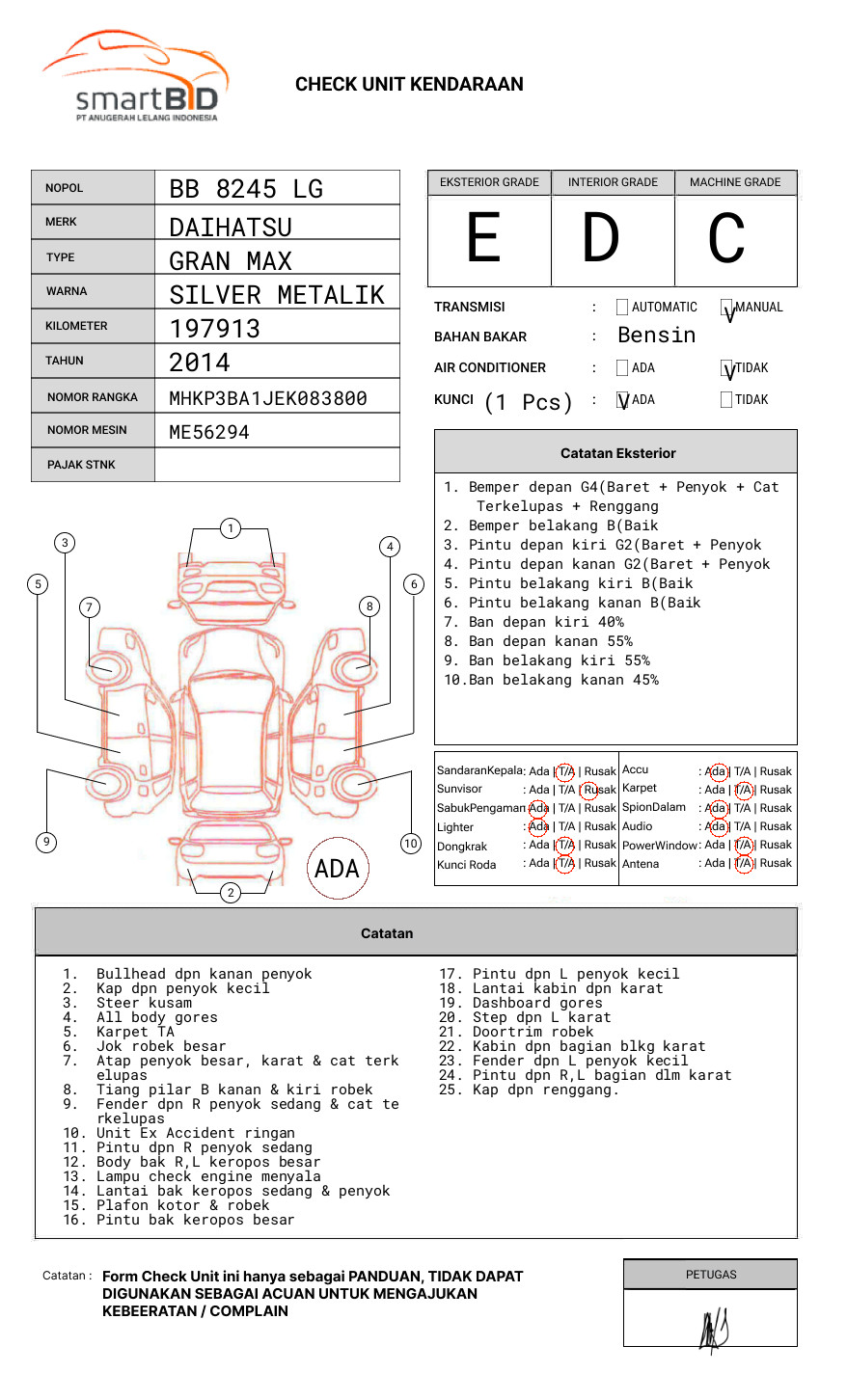 SEBELUM MELAKUKAN PENAWARAN UNIT PESERTA LELANG WAJIB MELAKUKAN PENGECEKAN UNIT DAN DOKUMEN TERLEBIH DAHULU // PIC GERMAN : 0812-6517-3060  // UNIT DIKENAKAN BIAYA PPN 1.1% DARI HARGA TERBENTUK //