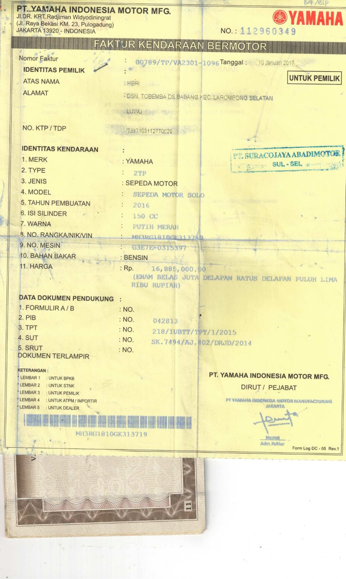 | No. Polisi | : | DP 3691 UF |