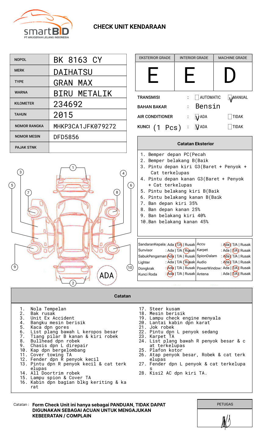 SEBELUM MELAKUKAN PENAWARAN UNIT PESERTA LELANG WAJIB MELAKUKAN PENGECEKAN UNIT DAN DOKUMEN TERLEBIH DAHULU // PIC GERMAN : 0812-6517-3060  // UNIT DIKENAKAN BIAYA PPN 1.1% DARI HARGA TERBENTUK // FAKTUR BERUPA FOTOCOPY