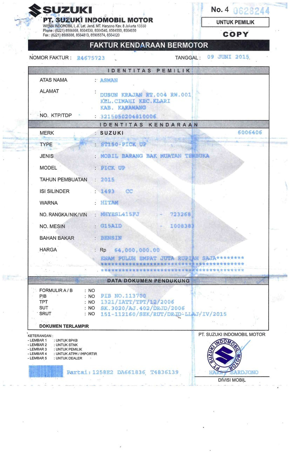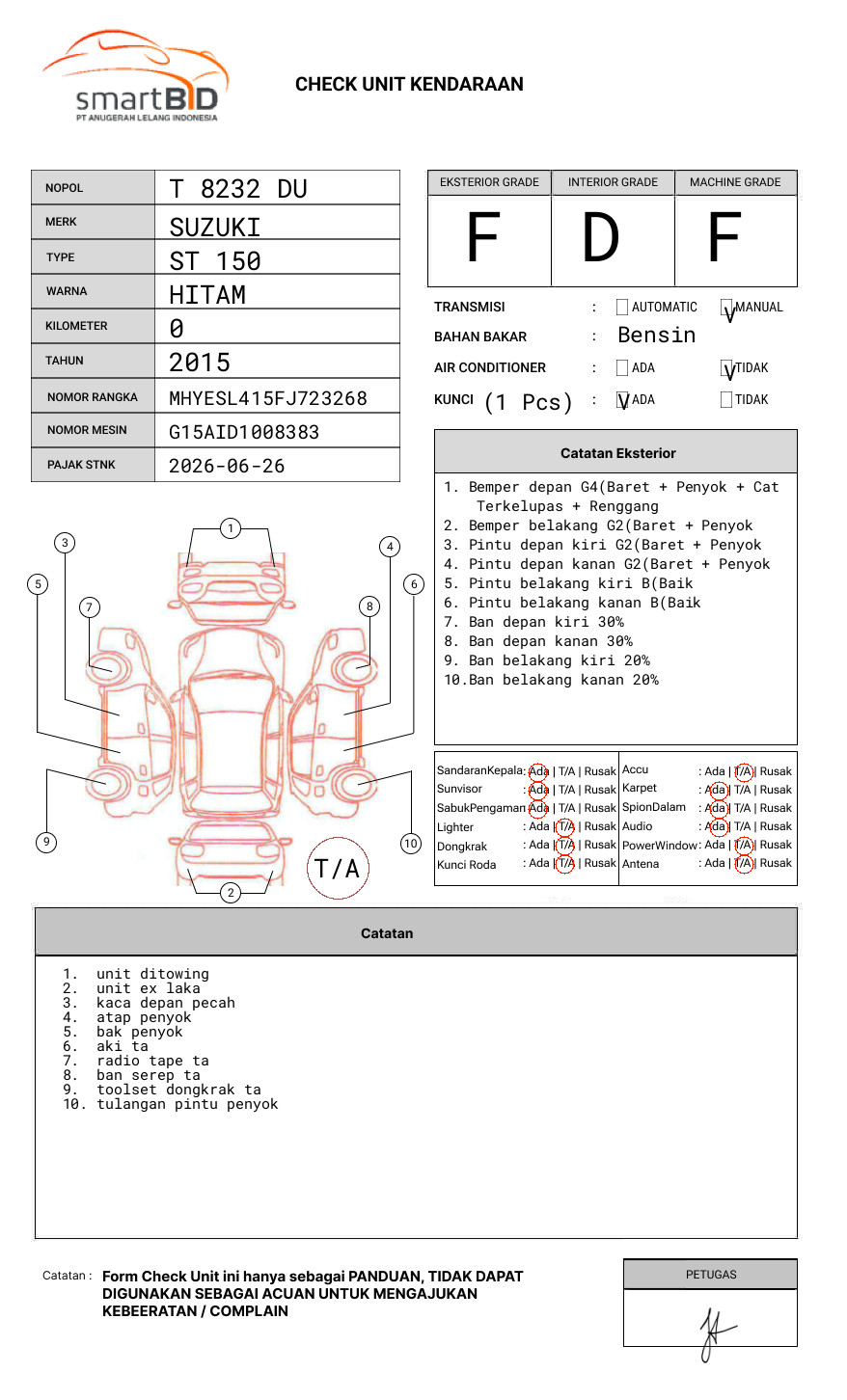SEBELUM MELAKUKAN PENAWARAN UNIT PESERTA LELANG WAJIB MELAKUKAN PENGECEKAN UNIT DAN DOKUMEN TERLEBIH DAHULU //WANDA :62 858-6767-0166  // UNIT DIKENAKAN BIAYA PPN 1.1% DARI HARGA TERBENTUK // DOKUMEN FISIK KEUR TIDAK JELAS// KARTU KEUR TA//