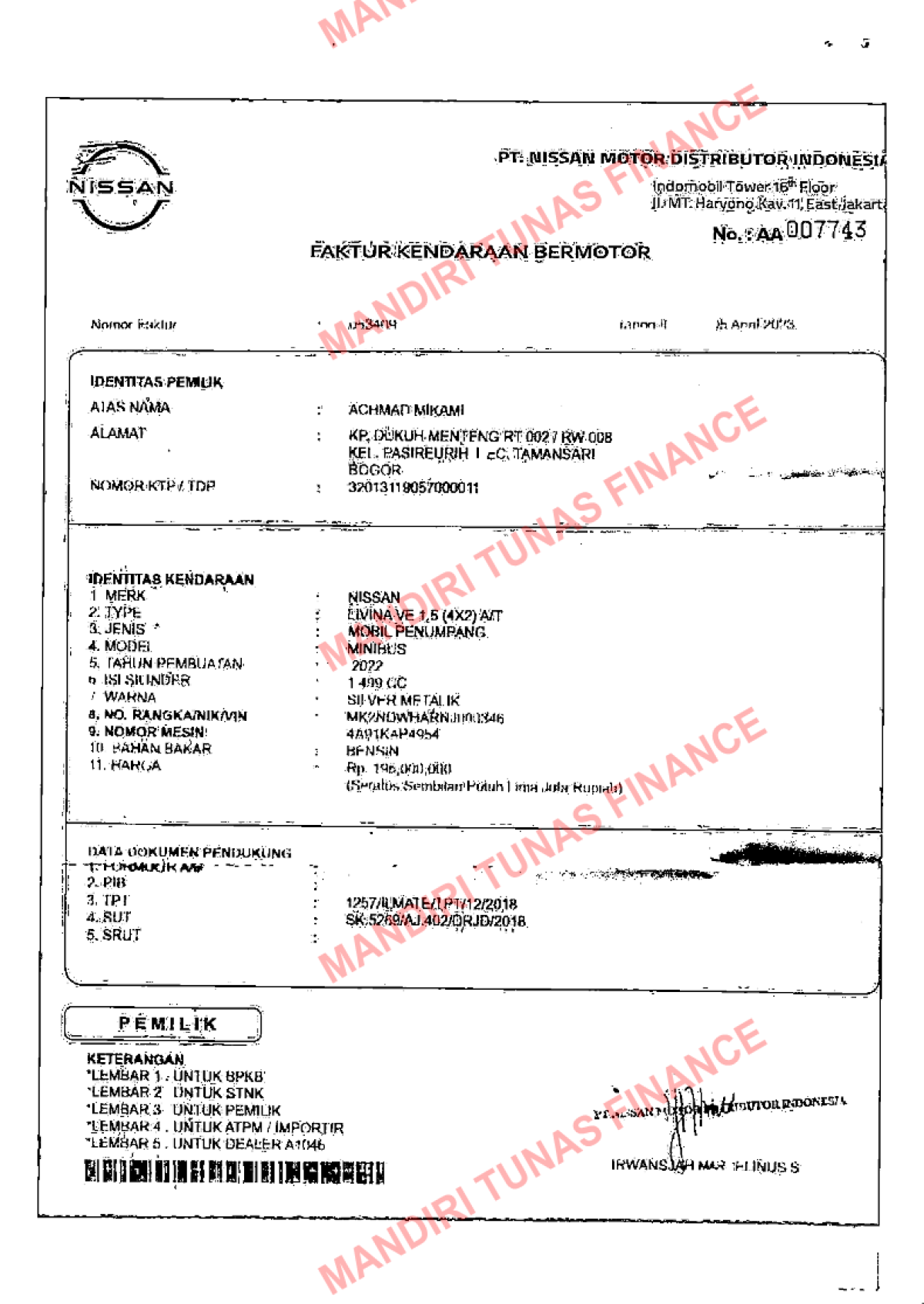 SEBELUM MELAKUKAN PENAWARAN UNIT PESERTA LELANG WAJIB MELAKUKAN PENGECEKAN UNIT DAN DOKUMEN TERLEBIH DAHULU // UNIT DIKENAKAN BIAYA PPN 1.1% DARI HARGA TERBENTUK // UNIT DIKENAKAN BIAYA ROYA FIDUSIA 100.000 // WANDA :62 858-6767-0166//FAKTUR BERUPA FOTOCOPY