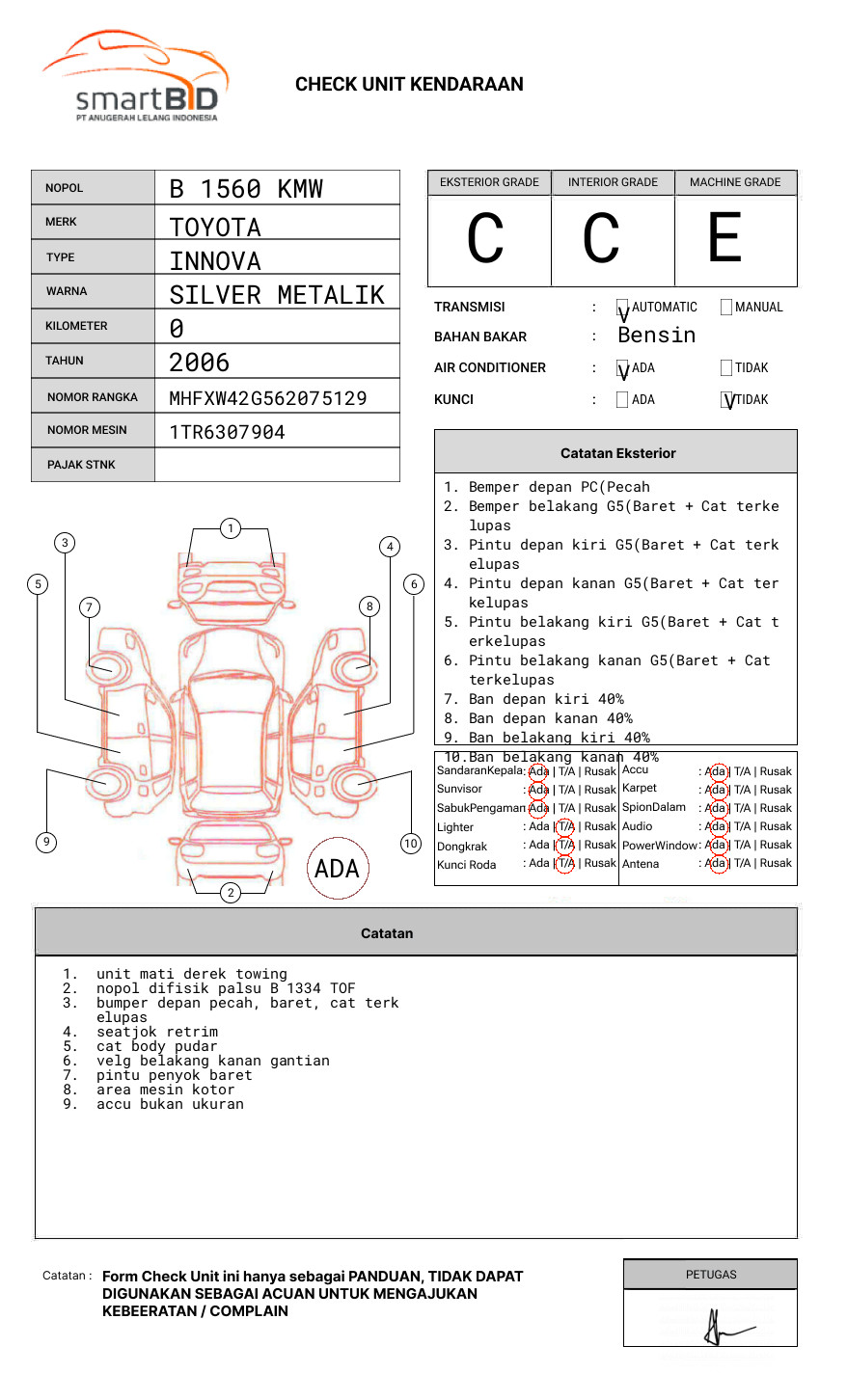 SEBELUM MELAKUKAN PENAWARAN UNIT PESERTA LELANG WAJIB MELAKUKAN PENGECEKAN UNIT DAN DOKUMEN TERLEBIH DAHULU // PIC WAHYU : 082124062748// UNIT DIKENAKAN BIAYA PPN 1.1% DARI HARGA TERBENTUK // TERDAPAT PERBEDAAN NOPOL FISIK DGN NOPOL DOKUMEN// PADA NOPOL FISIK "B 1334 TOF" SEDANGKAN NOPOL PADA DOKUMEN "B 1560 KMW"// INDIKASI NOPOL PALSU/BBN GANTUNG// DIGIT DEPAN NOKA TIDAK TERLIHAT