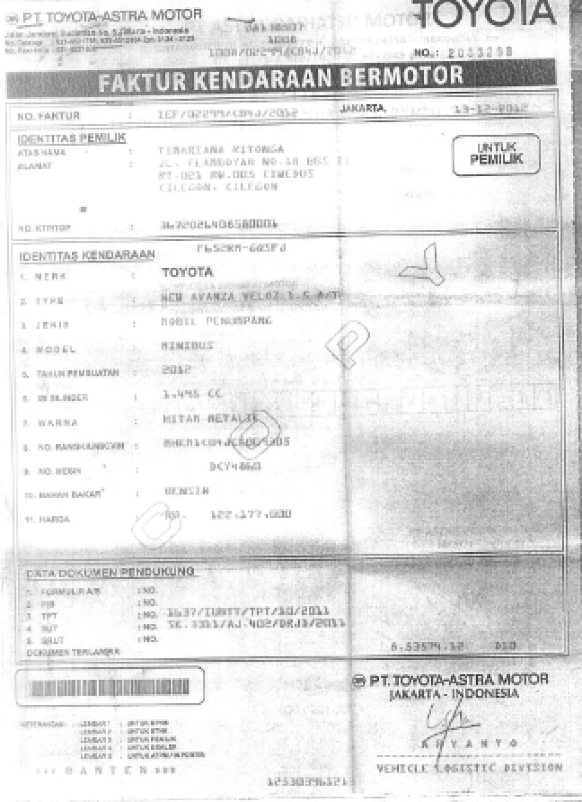 SEBELUM MELAKUKAN PENAWARAN UNIT PESERTA LELANG WAJIB MELAKUKAN PENGECEKAN UNIT DAN DOKUMEN TERLEBIH DAHULU // PIC TIAN : +62 896-6265-5959 // UNIT DIKENAKAN BIAYA PPN 1.1% DARI HARGA TERBENTUK // UNIT DIKENAKAN BIAYA ROYA FIDUSIA 100.000//FAKTUR BERUPA FOTOCOPY//ADA PERBEDAAN NOPOL FISIK DAN DOKUMEN BPKB//NOPOL FISIK (A 1130 DH), NOPOL BPKB (A 1289 TV)//INDIKASI BBN GANTUNG//LEMBAR PERUBAPAHAN IDENTITAS BPKB TA//