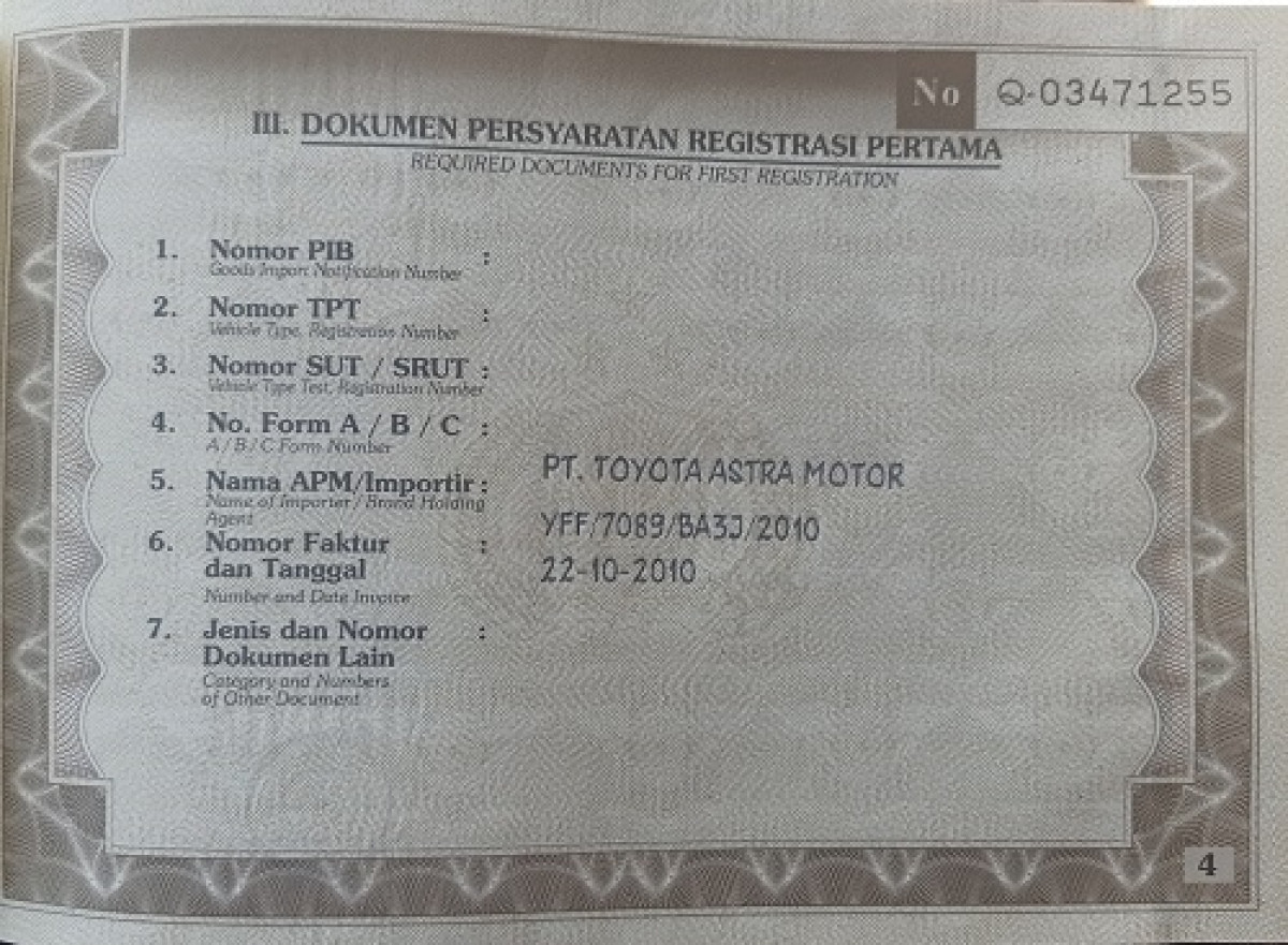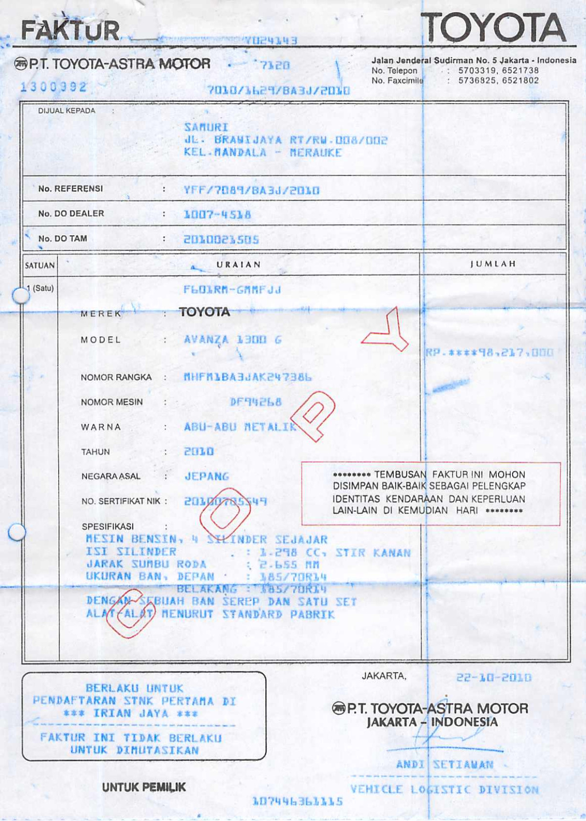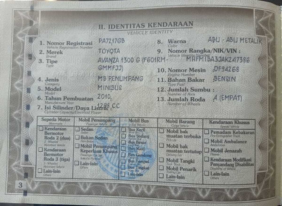UNIT TIDAK DILAKUKAN PENGECEKAN OLEH TIM SMARTBID// SEBELUM MELAKUKAN PENAWARAN HARAP CEK KONDISI UNIT DAN DOKUMEN TERLEBIH DAHULU// WAJIB MENGHUBUNGI PIC DAN DATANG KE LOKASI UNTUK PENGECEKAN UNIT// UNIT DILELANG APA ADANYA PERMASALAHAN YANG TIMBUL DILUAR TANGGUNG JAWAB SMARTBID// PENGAMBILAN UNIT SLIDE H+2 DARI PELUNASAN // JIKA INGIN MENGAMBIL UNIT HARAP UNTUK KONFIRMASI DAHULU KE SMARTBID // JIKA YANG MENGAMBIL BIDDER HARAP MEMBAWA KTP ASLI // JIKA PENGAMBILAN DIWAKILKAN WAJIB MEMBAWA SURAT KUASA ASLI // UNIT DIKENAKAN BIAYA PPN 1,1% DARI HARGA TERBENTUK// LOKASI UNIT HUBUNGI Bpk. Nando / Bpk Fatur 0852-7005-0894 / 0822-2759-3728 / CS PUSAT 081188089292// body baret dan ada penyok, bumper baret, unit plat kuning, noka karat, mesin rembes, kqaki-kaki bunyi, lampu kusam, velg repaint, cek engine nyala, interior kusam, tuas transmisi variasi, head unit variasi, jok sobek, ruang mesin kotor, //Spring (FR) | Header | Gasket Cover Head | Coil Ignition | Rim (Rr-R) | Fuel Pump | Rim (spare) | Rim (Fr-R) | Tire (spare) | Spring (RR) | Gasket Cylinder Head | Rim (Fr-L) | Tire (Fr-R) | Tire (Rr-R) | Rim (Rr-L) | Tire (Fr-L) | Clutch Plate | Wheel Bearing (Fr) | Engine Services (Heavy) | Wheel Bearing (Rr) | Check Engine Indikator | Brake Pad (Rr) | Clutch Bearing | Tire (Rr-L) | Brake Master | Rack Steer | Radiator Fan | Aircon Evaporator | Shocbreakers (Fr) | Battery | Spark Plug(s) | Radiator | Brake Pad (Fr) | Injector | Shocbreakers (Rr) | Fan Belt/Carseat (Fr-R) | Ceiling Trim | Carseat (Fr-L) | Tool Kit | Carpet | Bolt Crane and Jack | Interior Saloon | Gear Lever | Head Unit/Rim cover (Rr-R) | Rim cover (Fr-R) | Rim cover (Rr-L) | Rim cover (Fr-L) | Turn Lamp (Rr-L) | Taillight (Rr-R) | Turn Lamp (Rr-R) | Taillight (Rr-L) | Fog Lamp (R ) | Fog Lamp (L) | Roof Repair | Headlight (Fr-R) | Turn Lamp (Fr-R) | Door Repair (Fr-R) | Turn Lamp (Fr-L) | Engine Hood Repair | Headlight (Fr-L) | Door Repair (Fr-L) | Door Repair (Rr-L) | Door Repair (Rr-R) | Bumper Repair (Fr) | Door Repair (Trunk) | Bumper Repair (Rr)