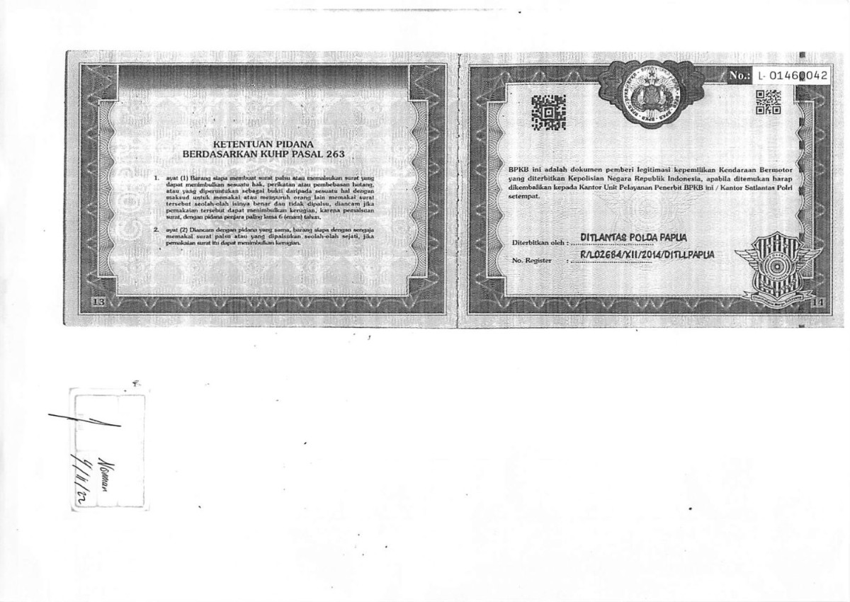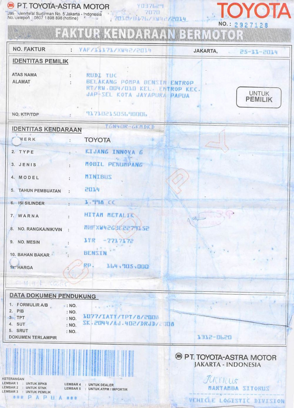 UNIT TIDAK DILAKUKAN PENGECEKAN OLEH TIM SMARTBID// SEBELUM MELAKUKAN PENAWARAN HARAP CEK KONDISI UNIT DAN DOKUMEN TERLEBIH DAHULU// WAJIB MENGHUBUNGI PIC DAN DATANG KE LOKASI UNTUK PENGECEKAN UNIT// UNIT DILELANG APA ADANYA PERMASALAHAN YANG TIMBUL DILUAR TANGGUNG JAWAB SMARTBID// PENGAMBILAN UNIT SLIDE H+2 DARI PELUNASAN // JIKA INGIN MENGAMBIL UNIT HARAP UNTUK KONFIRMASI DAHULU KE SMARTBID // JIKA YANG MENGAMBIL BIDDER HARAP MEMBAWA KTP ASLI // JIKA PENGAMBILAN DIWAKILKAN WAJIB MEMBAWA SURAT KUASA ASLI // UNIT DIKENAKAN BIAYA PPN 1,1% DARI HARGA TERBENTUK// LOKASI UNIT HUBUNGI Ibu. Desrina / Bpk. Yusmiar (Sitama Jayapura) 0823-6530-7560 / 0811-481-5003 / CS PUSAT 081188089292// Body baret, bumper pecah, interior kusam, ruang mesin kotor, interior kusam, nosin karat, lampu pecah kusam, body ex repaint, interior kusam, head unit variasi, atap kusam, jok sobek, stir kusam, laci dashboard t/a, mesin rembes.//Turbo | Header | Wheel Bearing (Fr) | Rim (Fr-R) | Tire (spare) | Gasket Cylinder Head | Fuel Pump | Tire (Rr-L) | Rim (Fr-L) | Coil Ignition | Engine Services (Heavy) | Fan Belt | Tire (Fr-R) | Gasket Cover Head | Tire (Fr-L) | Spring (RR) | Tire (Rr-R) | Rim (spare) | Rim (Rr-R) | Spring (FR) | Rim (Rr-L) | Brake Master | Aircon Evaporator | Clutch Bearing | Wheel Bearing (Rr) | Rack Steer | Radiator Fan | Radiator | Battery | Brake Pad (Rr) | Shocbreakers (Fr) | Clutch Plate | Brake Pad (Fr) | Shocbreakers (Rr) | Spark Plug(s)/Ceiling Trim | Bolt Crane and Jack | Steering-wheel | Carseat (Fr-R) | Tool Kit | Carseat (Fr-L) | Head Unit | Interior Saloon/Taillight (Rr-R) | Turn Lamp (Fr-R) | Taillight (Rr-L) | Turn Lamp (Rr-L) | Door Repair (Trunk) | Door Repair (Fr-R) | Fog Lamp (L) | Door Repair (Rr-R) | Turn Lamp (Rr-R) | Headlight (Fr-L) | Door Repair (Rr-L) | Turn Lamp (Fr-L) | Roof Repair | Headlight (Fr-R) | Fender Repair (Fr-R) | Fender Repair (Rr-R) | Door Repair (Fr-L) | Engine Hood Repair | Fog Lamp (R ) | Bumper Repair (Fr) | Bumper Repair (Rr) | Fender Repair (Fr-L) | Fender Repair (Rr-L)