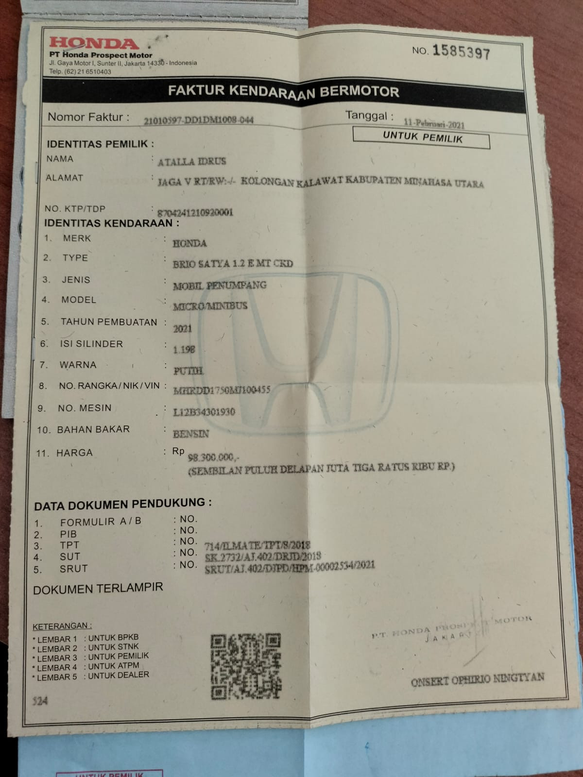 No. Rangka | : | MHRDD1750MJ100455 |