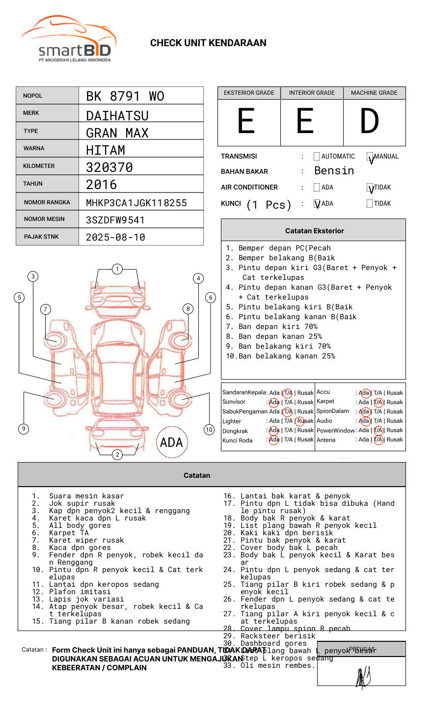 SEBELUM MELAKUKAN PENAWARAN UNIT PESERTA LELANG WAJIB MELAKUKAN PENGECEKAN UNIT DAN DOKUMEN TERLEBIH DAHULU // PIC GERMAN : 0812-6517-3060 // UNIT DIKENAKAN BIAYA PPN 1.1% DARI HARGA TERBENTUK //