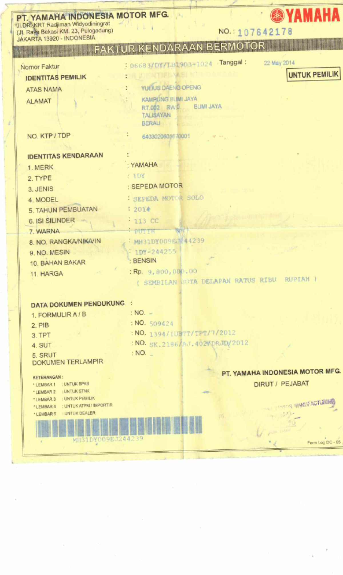 | No. Rangka | : | MH31DY009EJ244239 |