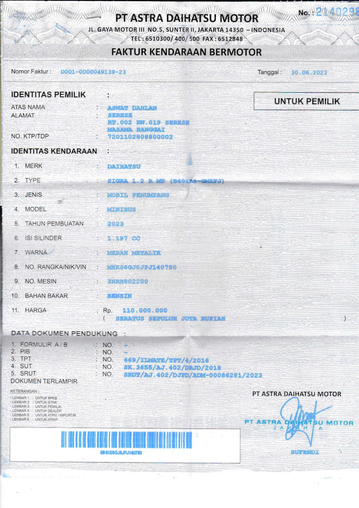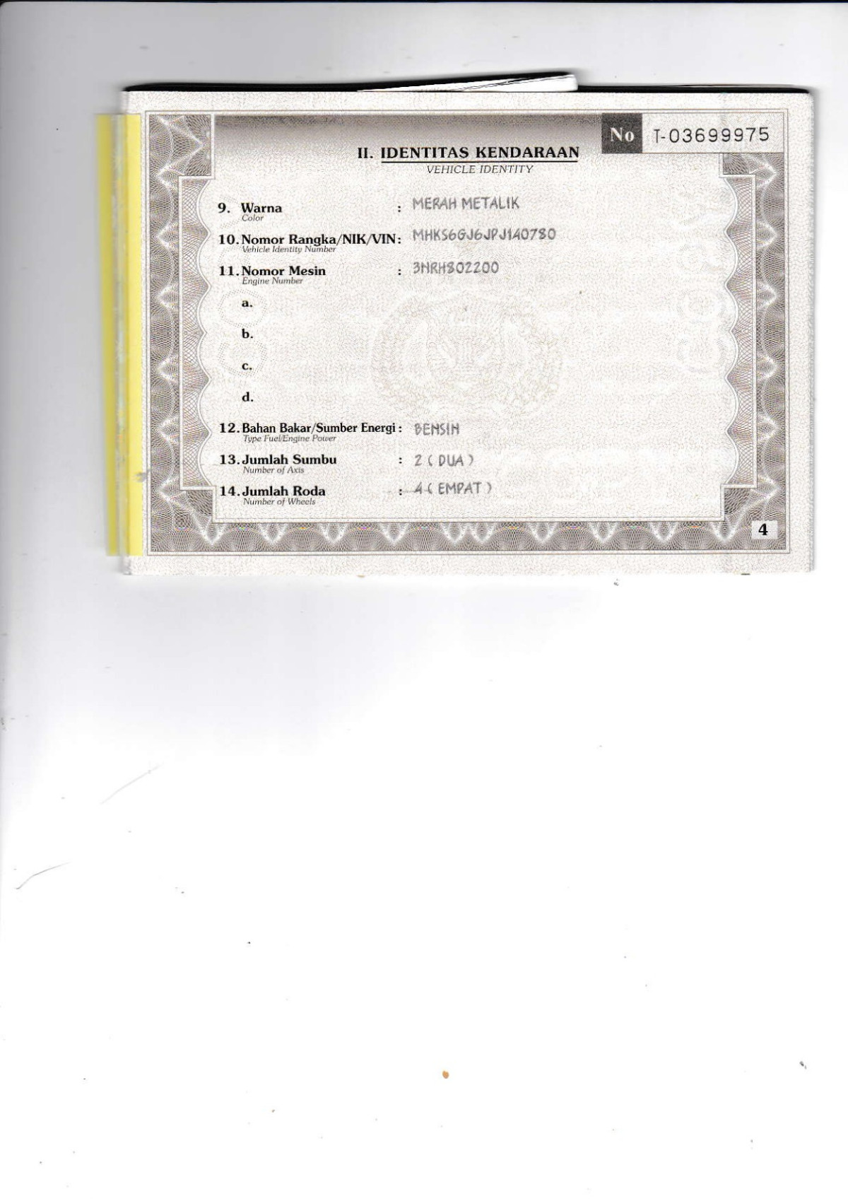 No. Rangka | : | MHKS6GJ6JPJ140780 |
