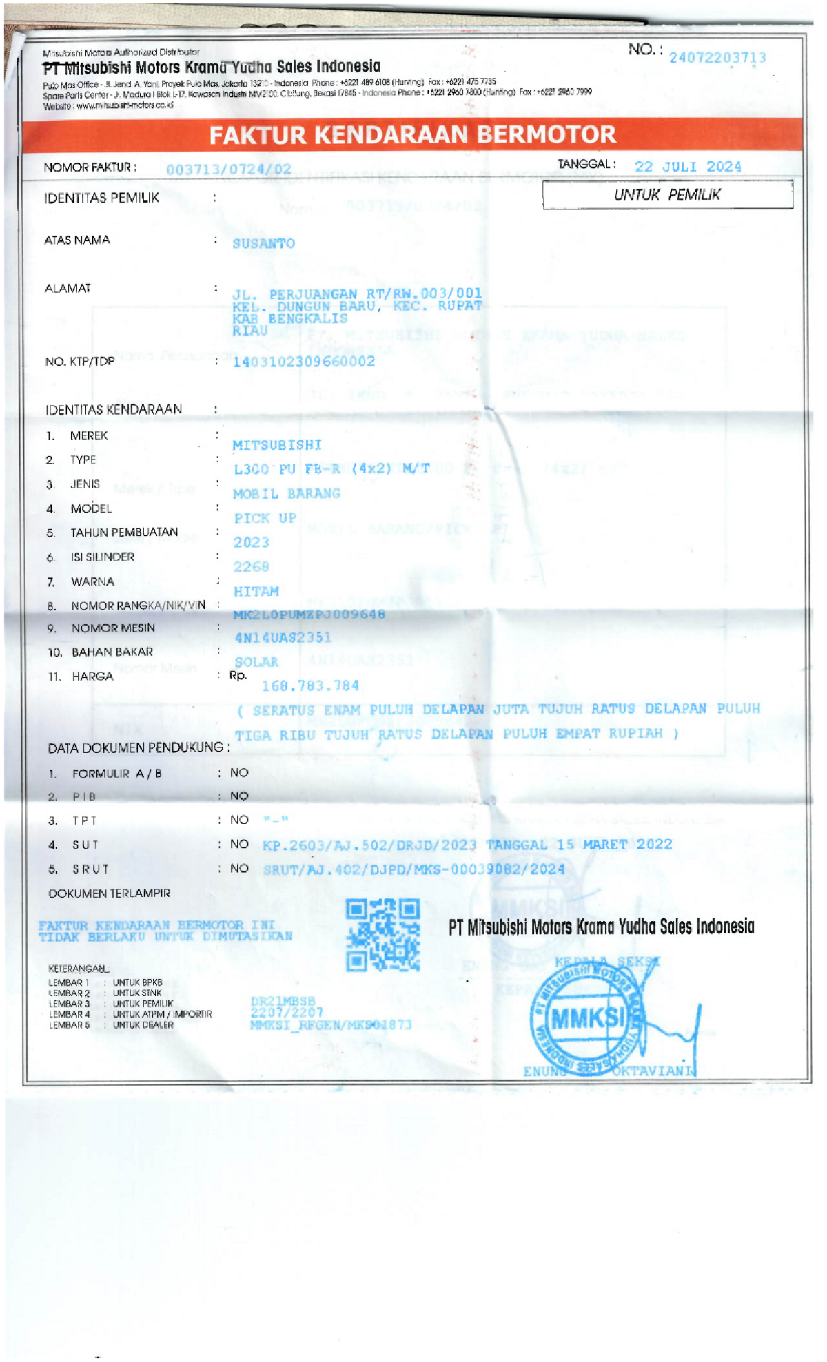 | No. Rangka | : | MK2L0PUMZPJ009648 |