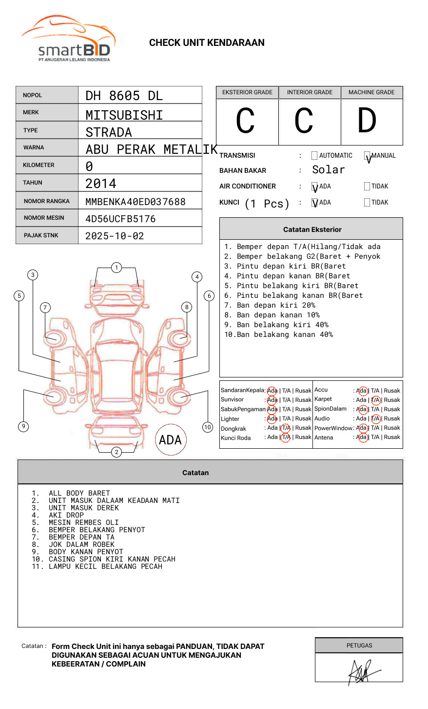 SEBELUM MELAKUKAN PENAWARAN UNIT PESERTA LELANG WAJIB MELAKUKAN PENGECEKAN UNIT DAN DOKUMEN TERLEBIH DAHULU // PIC BOY +62 821-8725-3174 / ASMAR 082278281728 // UNIT DIKENAKAN BIAYA PPN 1.1% DARI HARGA TERBENTUK //