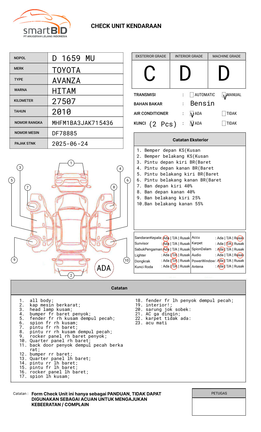 SEBELUM MELAKUKAN PENAWARAN UNIT PESERTA LELANG WAJIB MELAKUKAN PENGECEKAN UNIT DAN DOKUMEN TERLEBIH DAHULU // PIC DENNY : 0852-9442-5362 // UNIT DIKENAKAN BIAYA PPN 1.1% DARI HARGA TERBENTUK // FAKTUR BERUPA FOTOCOPY