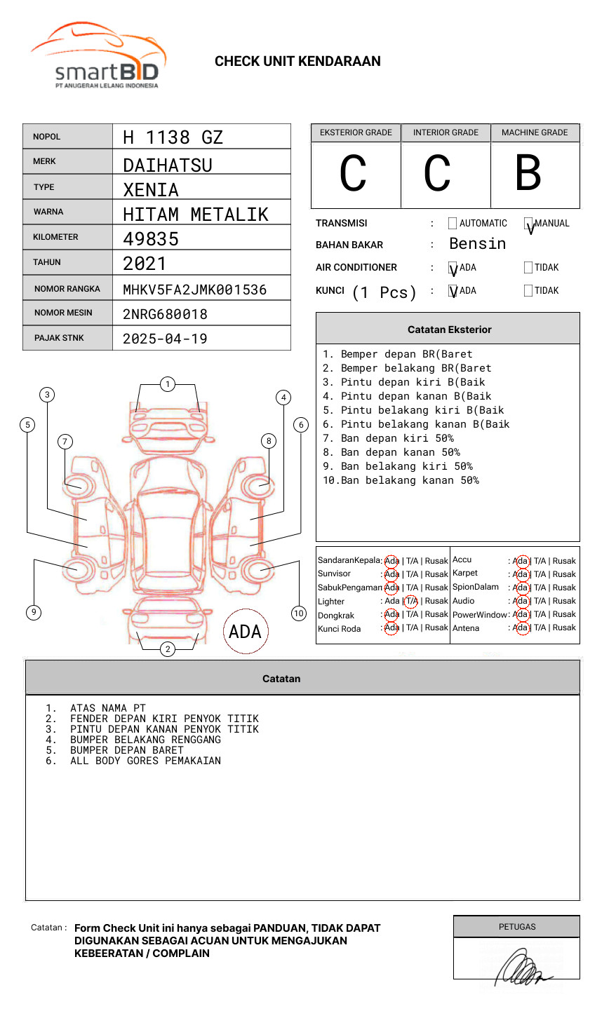 SEBELUM MELAKUKAN PENAWARAN UNIT PESERTA LELANG WAJIB MELAKUKAN PENGECEKAN UNIT DAN DOKUMEN TERLEBIH DAHULU // PIC TIAN : +62 896-6265-5959 //