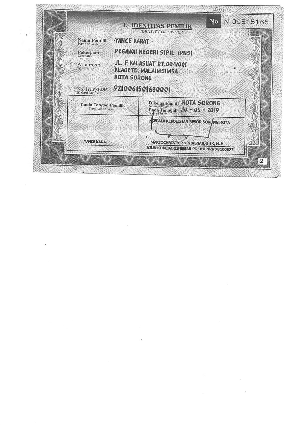 | FK. KTP | : | Tidak Ada |