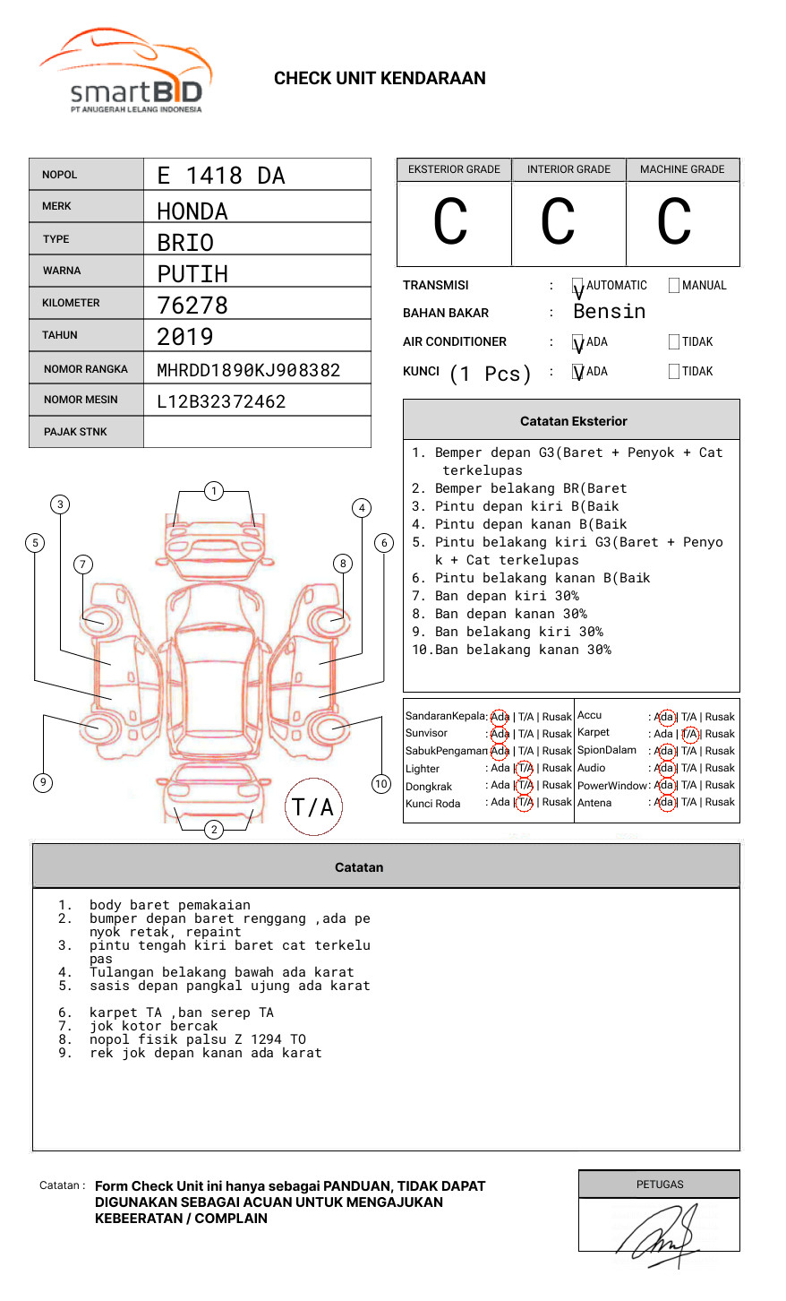 SEBELUM MELAKUKAN PENAWARAN UNIT PESERTA LELANG WAJIB MELAKUKAN PENGECEKAN UNIT DAN DOKUMEN TERLEBIH DAHULU // UNIT DIKENAKAN BIAYA PPN 1.1% DARI HARGA TERBENTUK // TERDAPAT PERBEDAAN NOPOL FISIK DGN DOKUMEN// PADA NOPOL FISIK "Z 1294 TQ" SEDANGKAN NOPOL PADA DOKUMEN "E 1418 DA"// INDIKASI NOPOL PALSU/BBN GANTUNG// PIC MAS UD : 081213061687