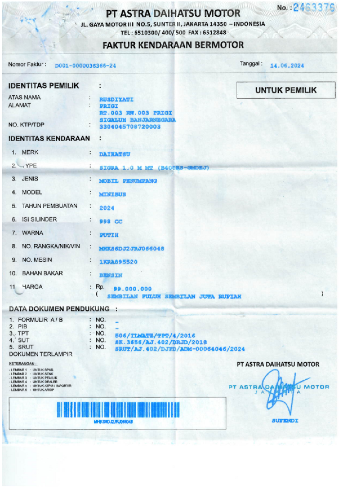 SEBELUM MELAKUKAN PENAWARAN UNIT PESERTA LELANG WAJIB MELAKUKAN PENGECEKAN UNIT DAN DOKUMEN TERLEBIH DAHULU // PIC ERVAN 081353402514 // UNIT DIKENAKAN BIAYA PPN 1.1% DARI HARGA TERBENTUK //ADA PERBEDAAN TIPE PADA STNK, BPKB, DAN FAKTUR// FAKTUR DAN BPKB (SIGRA M) PADA STNK (SIGRA D)//PEMENANG LELANG WAJIB TTD SURAT PERNYATAAN DIATAS MATERAI
