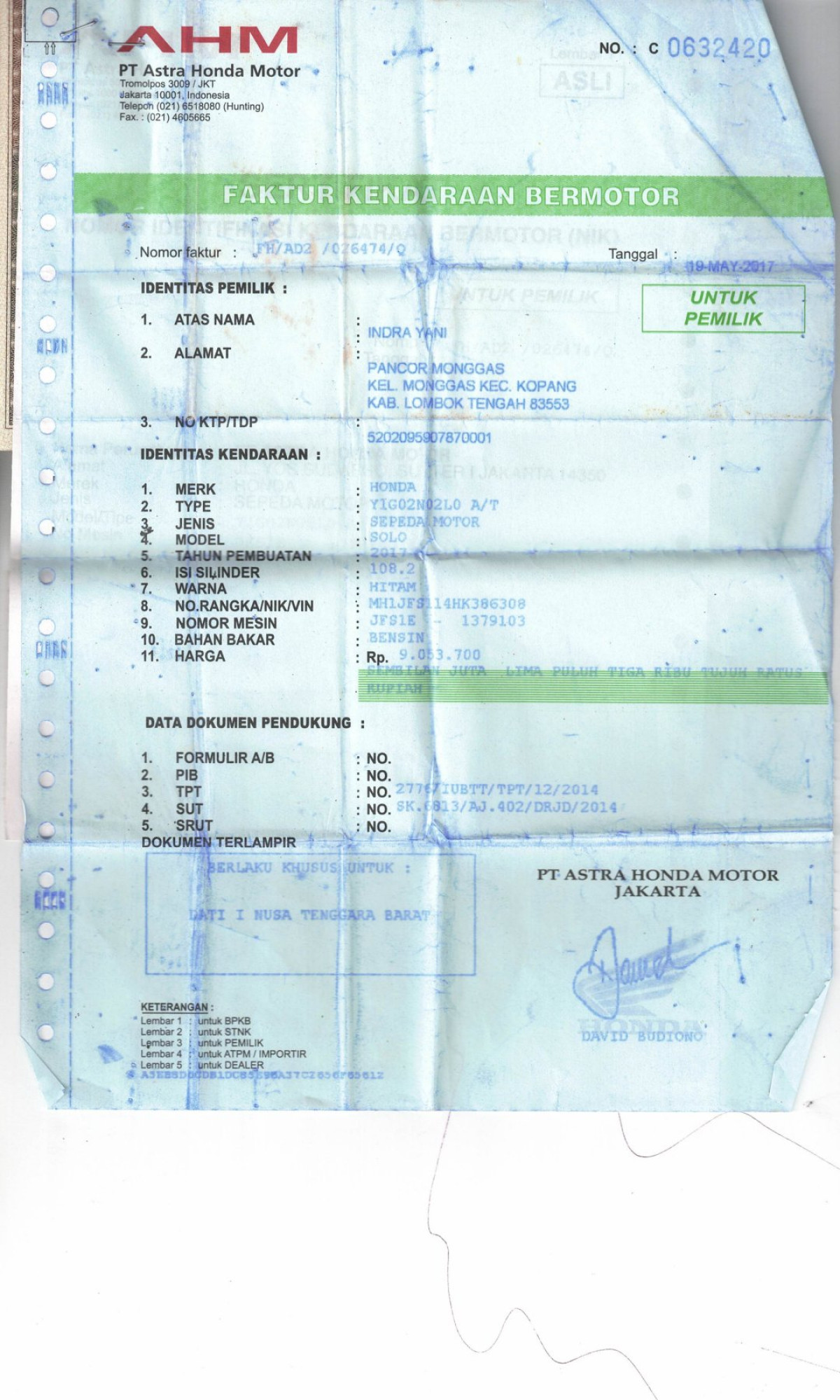 UNIT TIDAK DILAKUKAN PENGECEKAN OLEH TIM SMARTBID// SEBELUM MELAKUKAN PENAWARAN HARAP CEK KONDISI UNIT DAN DOKUMEN TERLEBIH DAHULU// WAJIB MENGHUBUNGI PIC DAN DATANG KE LOKASI UNTUK PENGECEKAN UNIT// UNIT DILELANG APA ADANYA PERMASALAHAN YANG TIMBUL DILUAR TANGGUNG JAWAB SMARTBID// JIKA INGIN MENGAMBIL UNIT HARAP UNTUK KONFIRMASI DAHULU KE SMARTBID // JIKA YANG MENGAMBIL BIDDER HARAP MEMBAWA KTP ASLI// FOTO NOSIN TIDAK TERLIHAT JELAS//