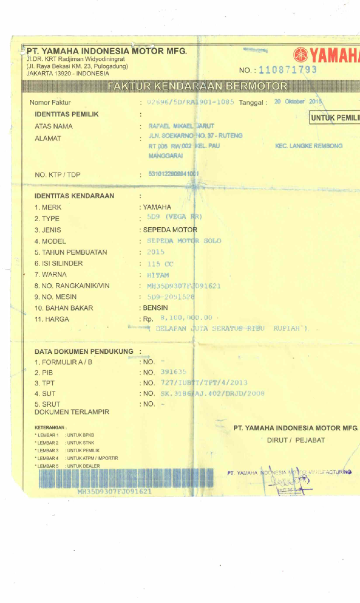 | No. Rangka | : | MH35D9307FJ091621 |