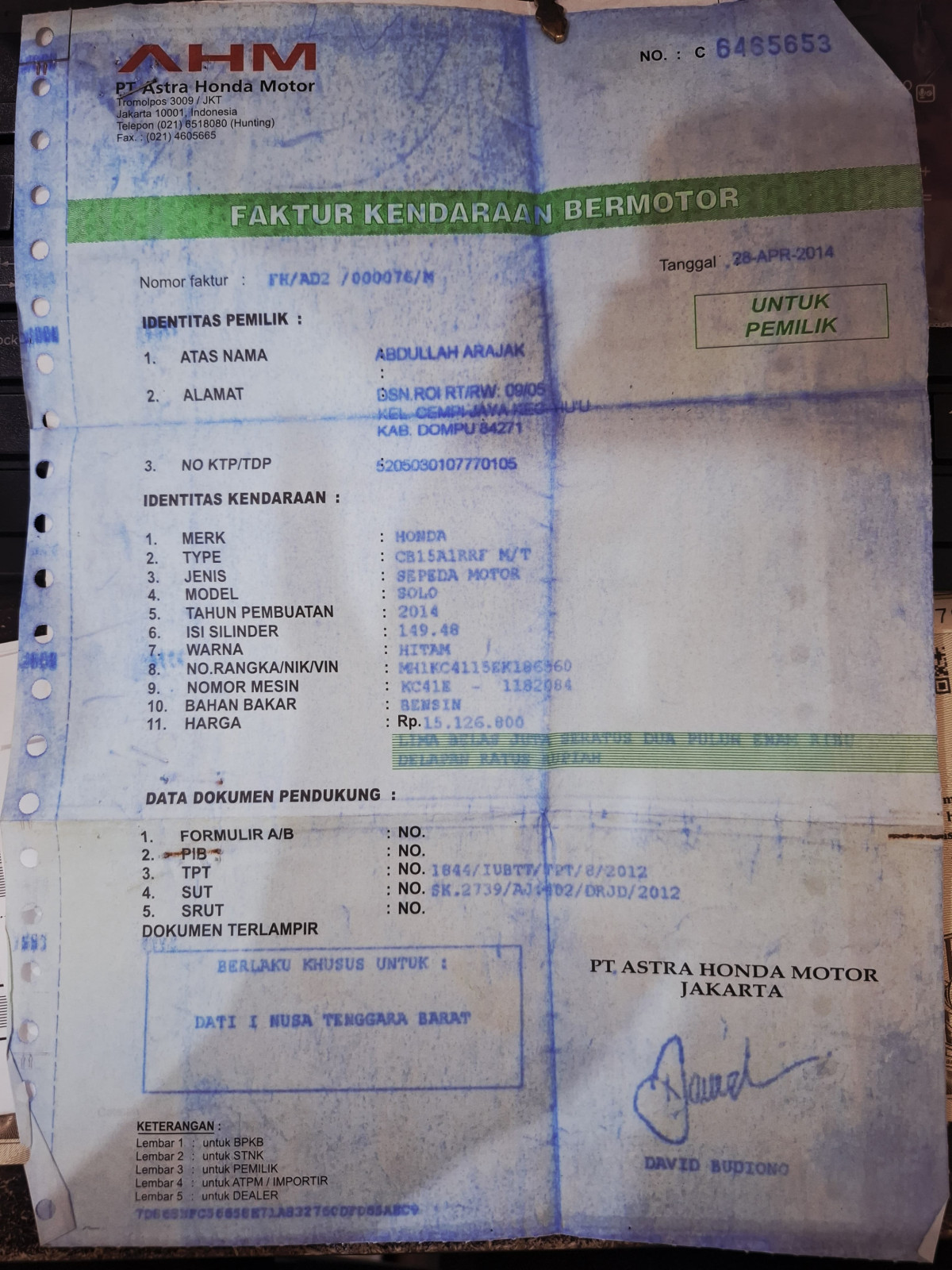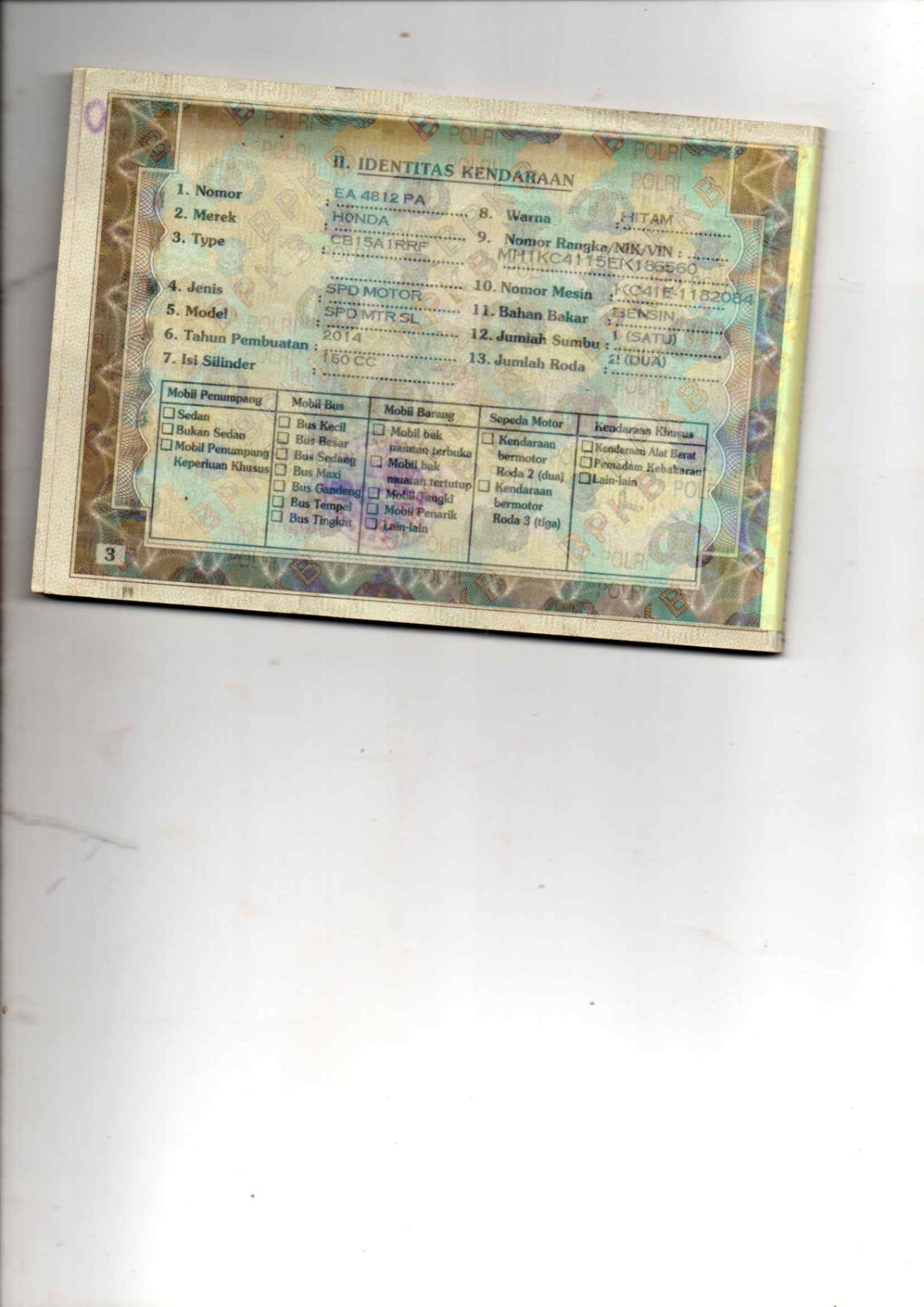 UNIT TIDAK DILAKUKAN PENGECEKAN OLEH TIM SMARTBID// SEBELUM MELAKUKAN PENAWARAN HARAP CEK KONDISI UNIT DAN DOKUMEN TERLEBIH DAHULU// WAJIB MENGHUBUNGI PIC DAN DATANG KE LOKASI UNTUK PENGECEKAN UNIT// UNIT DILELANG APA ADANYA PERMASALAHAN YANG TIMBUL DILUAR TANGGUNG JAWAB SMARTBID// JIKA INGIN MENGAMBIL UNIT HARAP UNTUK KONFIRMASI DAHULU KE SMARTBID // JIKA YANG MENGAMBIL BIDDER HARAP MEMBAWA KTP ASLI