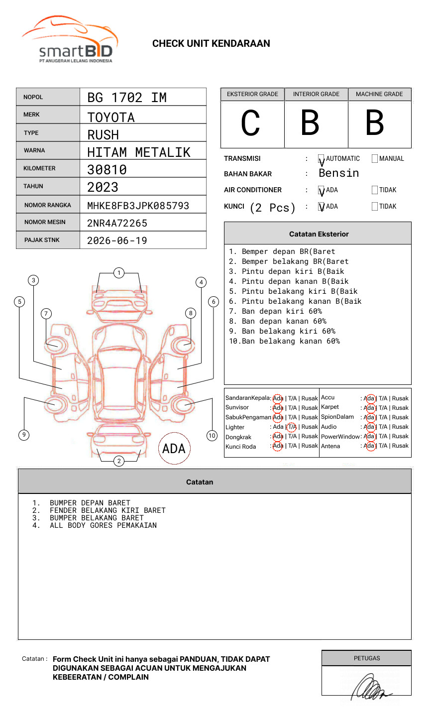 SEBELUM MELAKUKAN PENAWARAN UNIT PESERTA LELANG WAJIB MELAKUKAN PENGECEKAN UNIT DAN DOKUMEN TERLEBIH DAHULU // PIC TIAN : +62 896-6265-5959 // UNIT DIKENAKAN BIAYA PPN 1.1% DARI HARGA TERBENTUK //