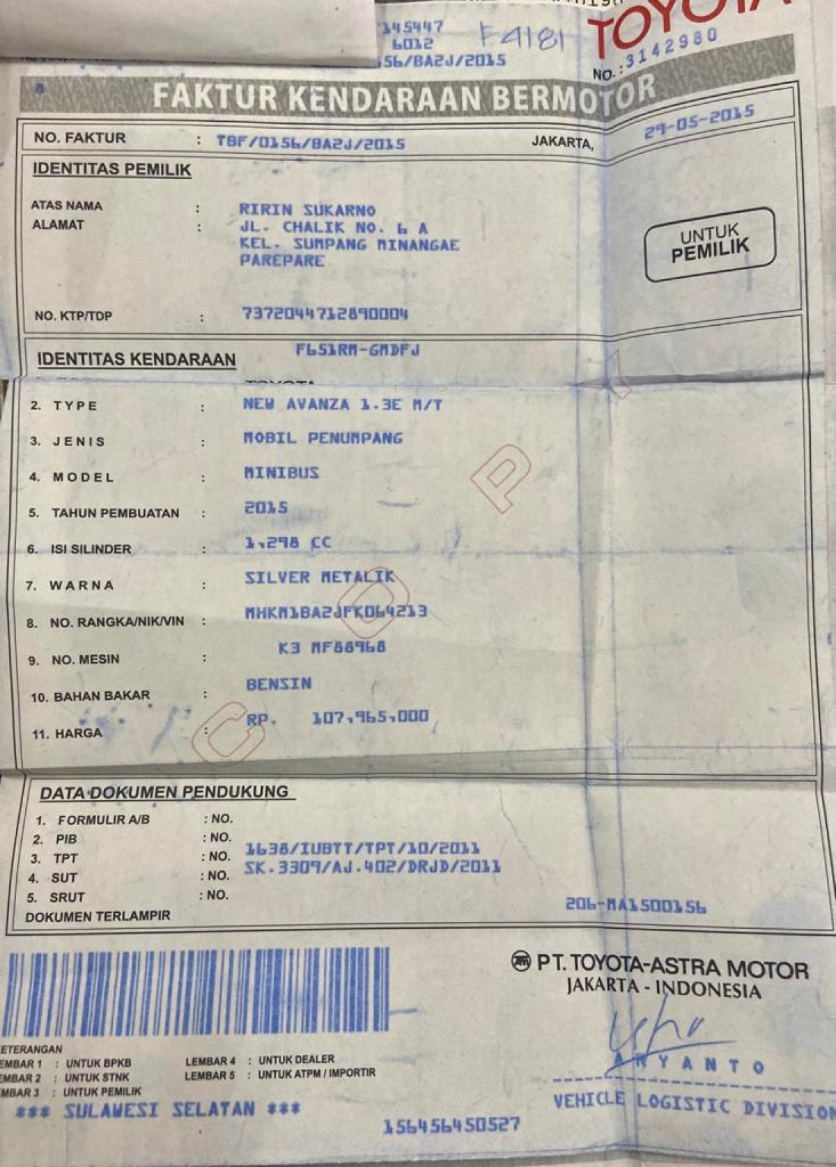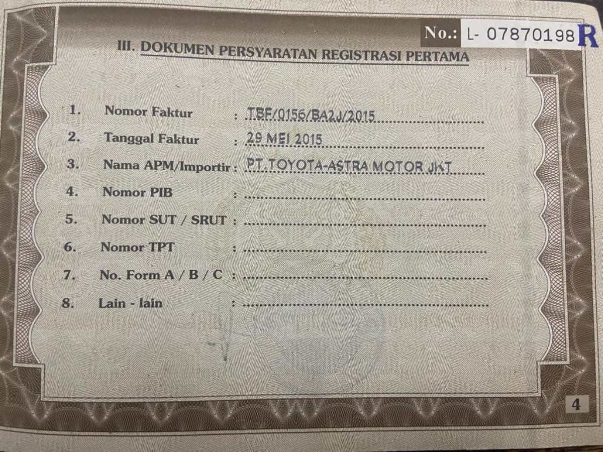 NOPOL FISIK TA// UNIT TIDAK DILAKUKAN PENGECEKAN OLEH TIM SMARTBID// SEBELUM MELAKUKAN PENAWARAN HARAP CEK KONDISI UNIT DAN DOKUMEN TERLEBIH DAHULU// WAJIB MENGHUBUNGI PIC DAN DATANG KE LOKASI UNTUK PENGECEKAN UNIT// UNIT DILELANG APA ADANYA PERMASALAHAN YANG TIMBUL DILUAR TANGGUNG JAWAB SMARTBID// PENGAMBILAN UNIT SLIDE H+2 DARI PELUNASAN // JIKA INGIN MENGAMBIL UNIT HARAP UNTUK KONFIRMASI DAHULU KE SMARTBID // JIKA YANG MENGAMBIL BIDDER HARAP MEMBAWA KTP ASLI // JIKA PENGAMBILAN DIWAKILKAN WAJIB MEMBAWA SURAT KUASA ASLI // UNIT DIKENAKAN BIAYA PPN 1,1% DARI HARGA TERBENTUK// HUB PIC Bpk. Ferdy 0822-4916-6365 // LOKASI UNIT HUBUNGI CS PUSAT 081188089292// Mesin berfungsi, Indikasi unit eks laka lantas, Bullhead ex-repair (sudah ganti), Body tergores (sebagian cat terkelupas), Alarm tidak ada, Ban cadangan tidak ada, Alat mobil tidak ada, Head unit imitasi, Mesin rembes oli, Jok baris ketiga tidak ada//Wheel Bearing (Rr) | Wheel Bearing (Fr) | Tire (Rr-L) | Tire (Fr-L) | Spring (FR) | Rack Steer | Spring (RR) | Coil Ignition | Fan Belt | Rim (spare) | Tire (spare) | Brake Pad (Fr) | Tire (Fr-R) | Radiator Fan | Tire (Rr-R) | Gasket Cylinder Head | Brake Pad (Rr) | Remote | Battery | Clutch Plate | Spark Plug(s) | Clutch Bearing | Injector | Brake Master | Aircon Evaporator | Engine Services (Light)/Headrest (Rr-R) | Carpet | Bolt Crane and Jack | Carseat (Rr-R) | Carpet Floor (RR) | Aircon Panel | Ceiling Lamp (Fr) | Carseat (Rr-L) | Carpet Floor (FR-R) | Ceiling Lamp (Rr) | Headrest (Rr-L) | Ceiling Trim | Gear Lever Cover | Carpet Floor (Mid) | Tool Kit | Head Unit | Carpet Floor (FR-L) | Interior Saloon/Emblem | Roof Repair | Side Skirt Repair (L) | Door Repair (Trunk) | Turn Lamp (Rr-R) | Engine Hood Repair | Fog Lamp (L) | Fog Lamp (R ) | Turn Lamp (Rr-L) | Taillight (Rr-R) | Side Skirt Repair (R) | Windshield Wiper | Fender Repair (Rr-R) | Taillight (Rr-L) | Fender Repair (Rr-L) | Headlight (Fr-R) | Fender Repair (Fr-L) | Turn Lamp (Fr-R) | Bumper Repair (Rr) | Bumper Repair (Fr) | Turn Lamp (Fr-L) | Headlight (Fr-L) | Mirror (R ) | Fender Repair (Fr-R) | Mirror (L)