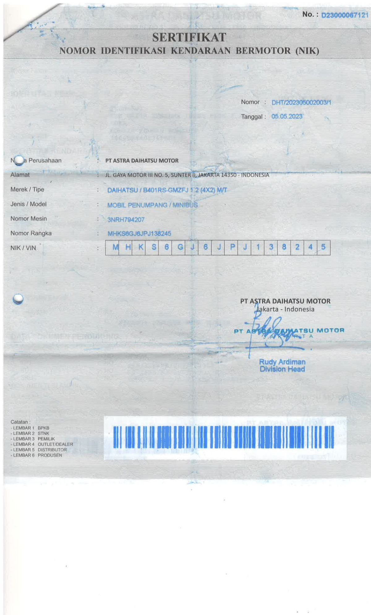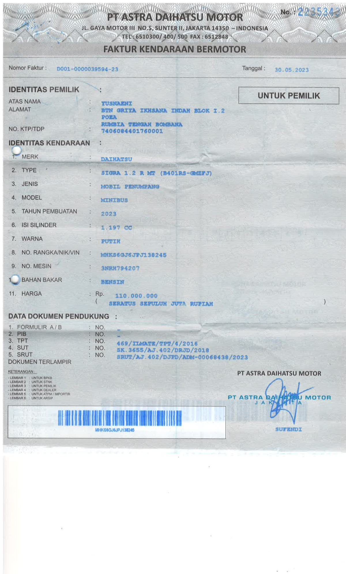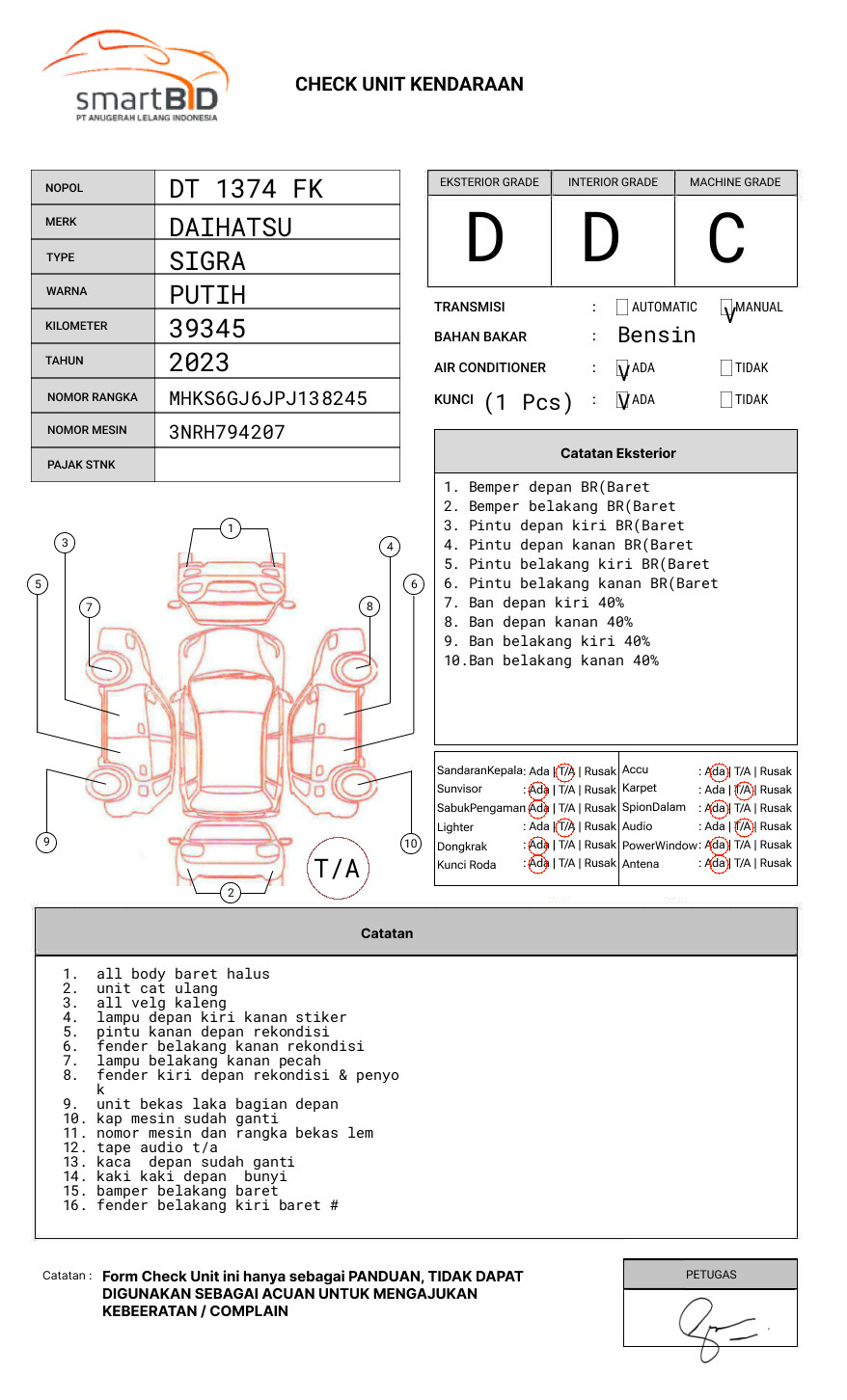 NOMOR RANGKA DAN NOMOR MESIN EX DILEM BESI // 1DIGIT NOSIN TIDAK TERBACA // SEBELUM MELAKUKAN PENAWARAN UNIT PESERTA LELANG WAJIB MELAKUKAN PENGECEKAN UNIT DAN DOKUMEN TERLEBIH DAHULU // PIC LULU +62 856-5712-5589//UNIT DIKENAKAN BIAYA PPN 1.1% DARI HARGA TERBENTUK // ADA PERBEDAAN NOPOL APDA FISIK DD1257GX PADA DOKUMEN DT 1374FK // PEMENANG LELANG WAJIB TTD SURAT PERNYATAAN DIATAS MATERAI //