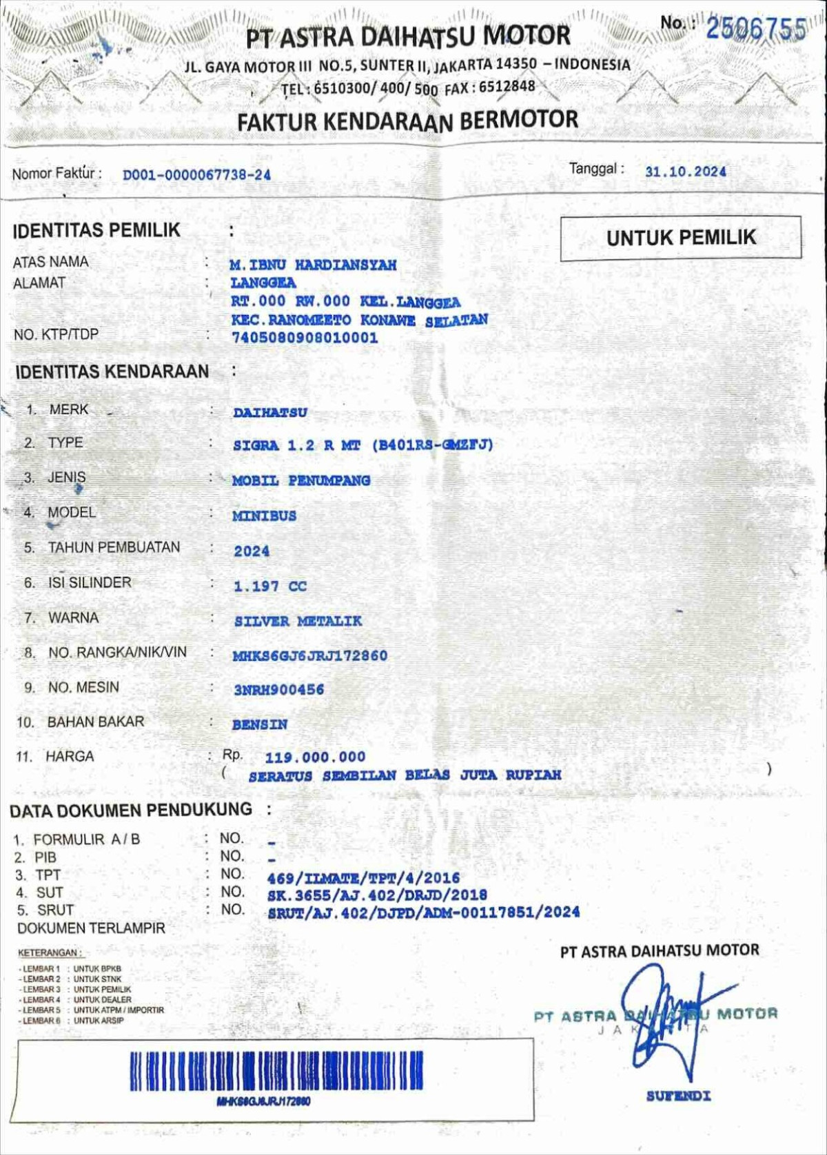 | No. Rangka | : | MHKS6GJ6JRJ172860 |