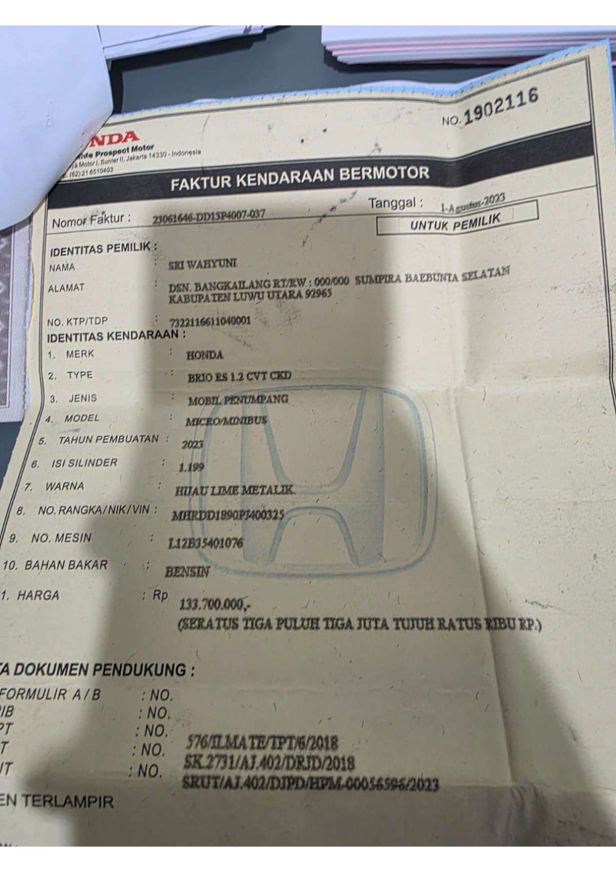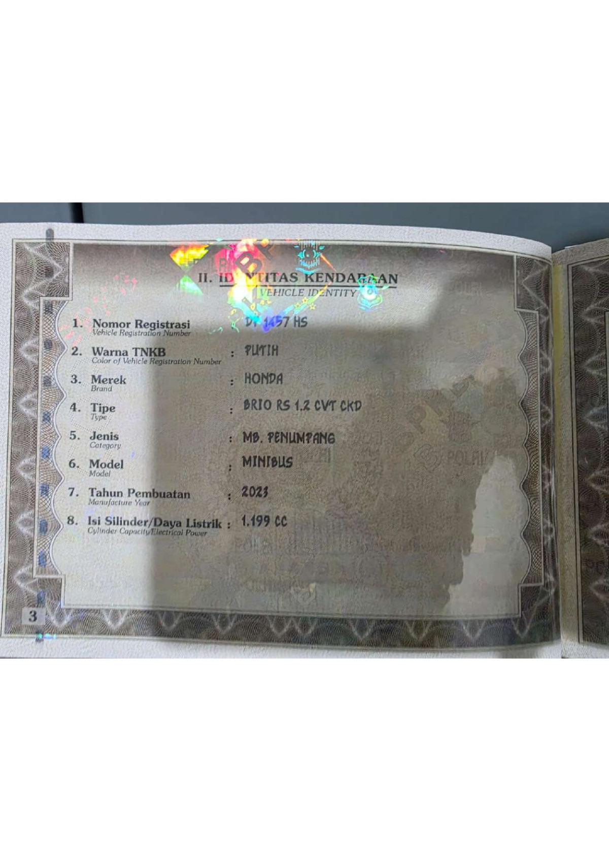 | No. Polisi | : | DP 1457 HS |