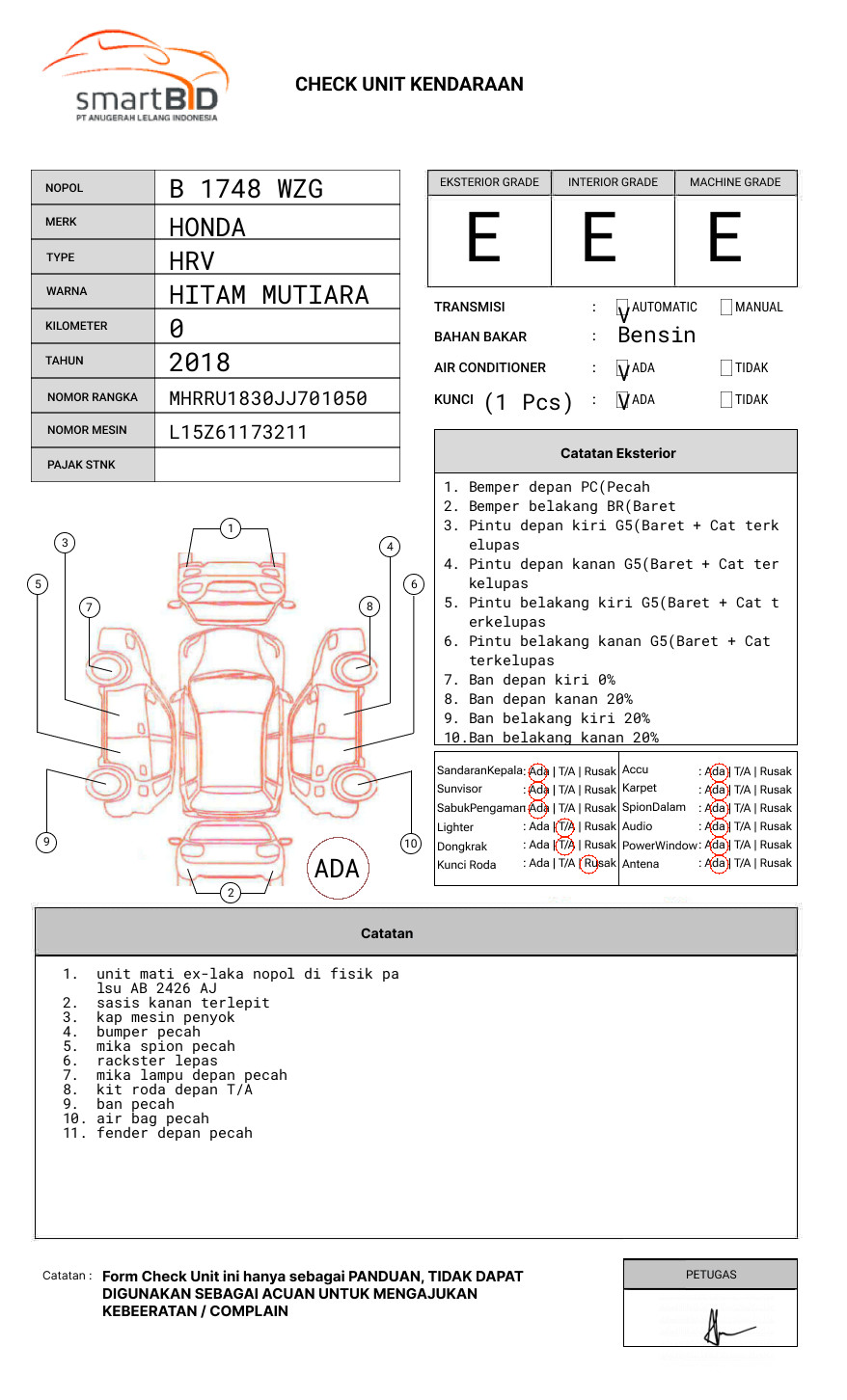SEBELUM MELAKUKAN PENAWARAN UNIT PESERTA LELANG WAJIB MELAKUKAN PENGECEKAN UNIT DAN DOKUMEN TERLEBIH DAHULU // PIC WAHYU : 082124062748// UNIT DIKENAKAN BIAYA PPN 1.1% DARI HARGA TERBENTUK // ADA PERBEDAAN PADA NOPOL FISIK DAN DOKUMEN BPKB//PADA FISIK (AB 2426 AJ) PADA BPKB (B 1748 WZG) // INDIKASI NOPOL PALSU/BBN GANTUNG//LEMBAR PERUBAHAN NOPOL PADA BPKB TA