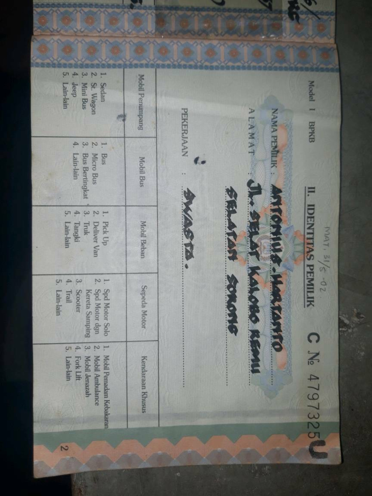 | No. Polisi | : | PB 9784 S |