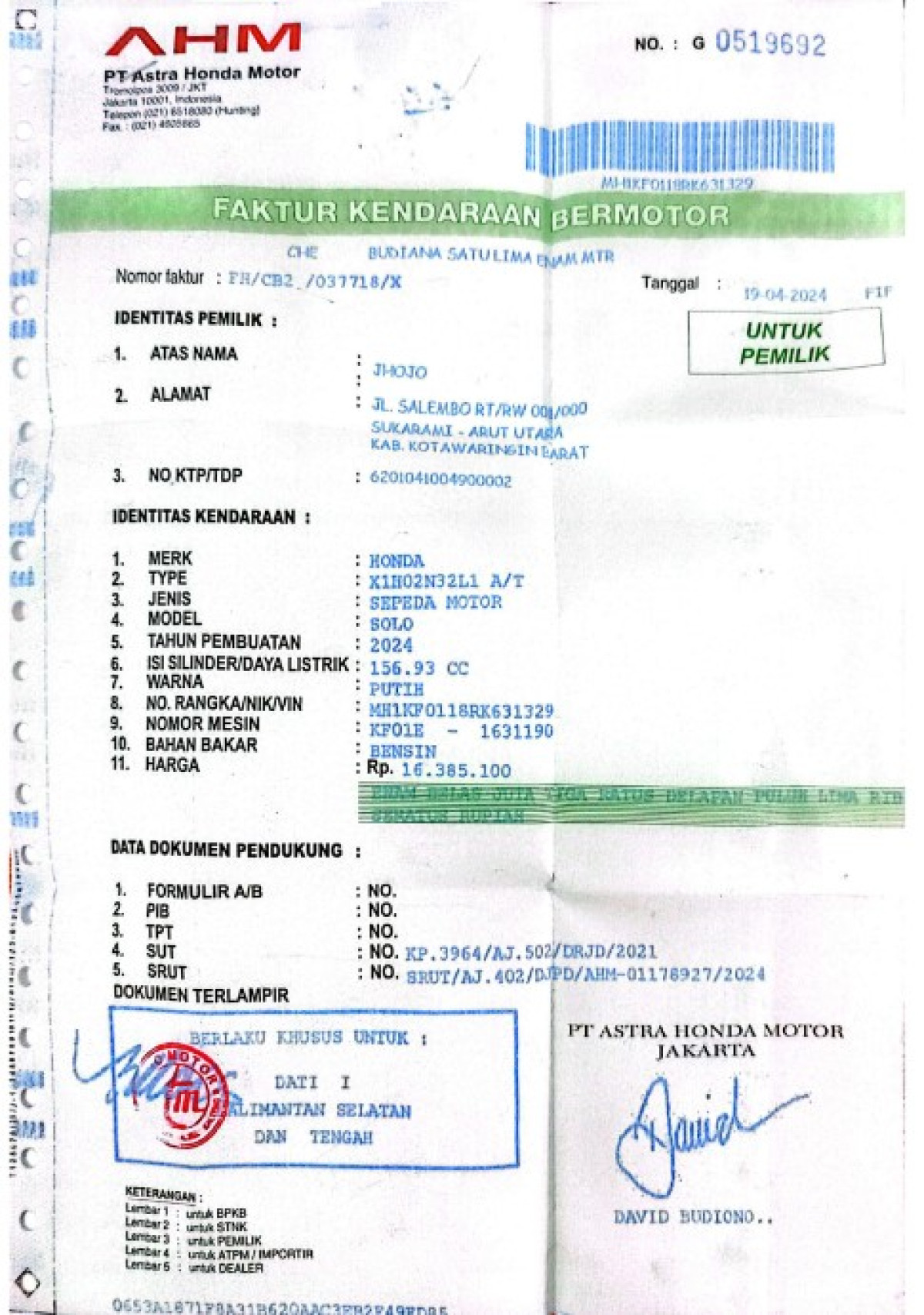 | No. Rangka | : | MH1KF0118RK631329 |