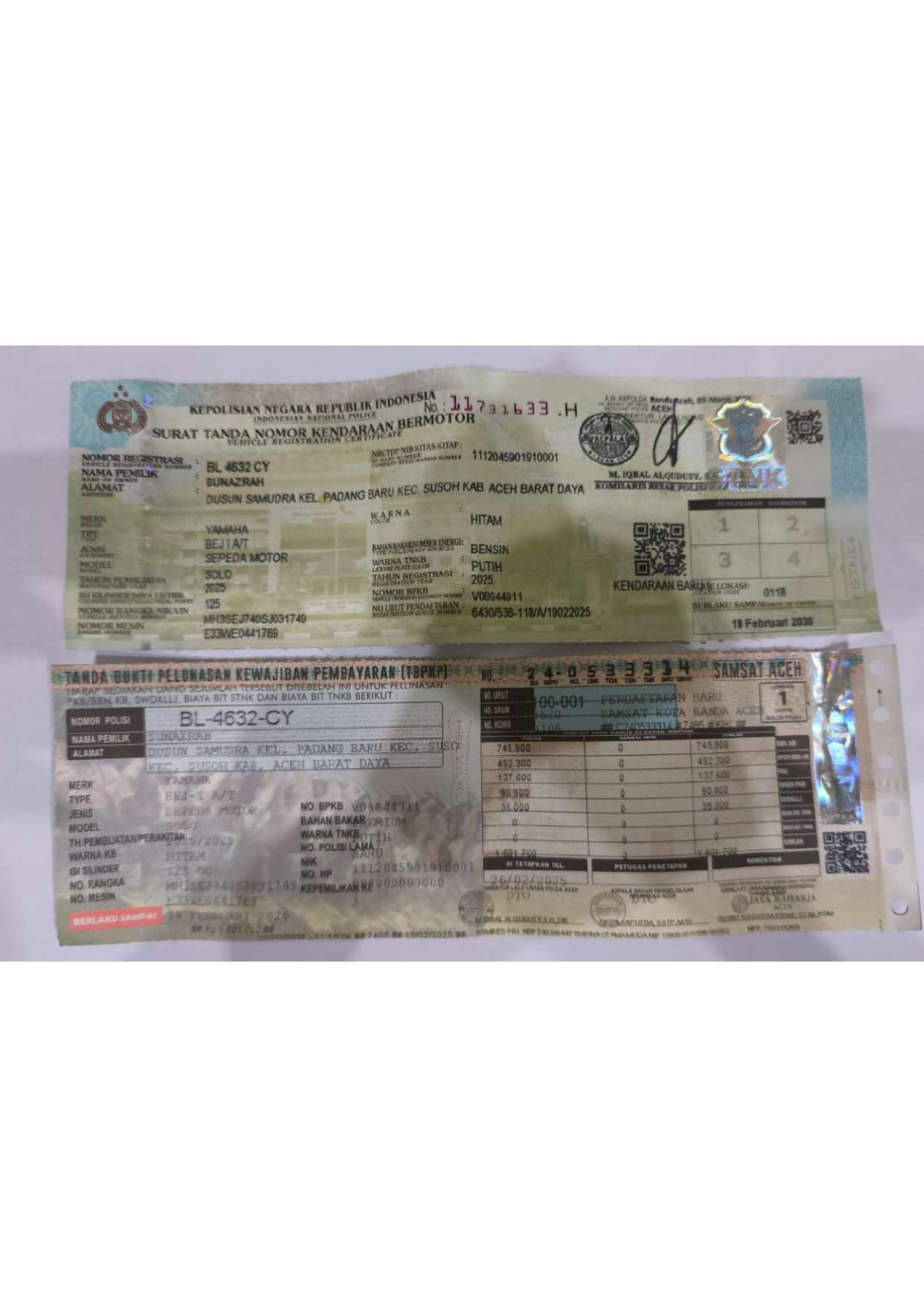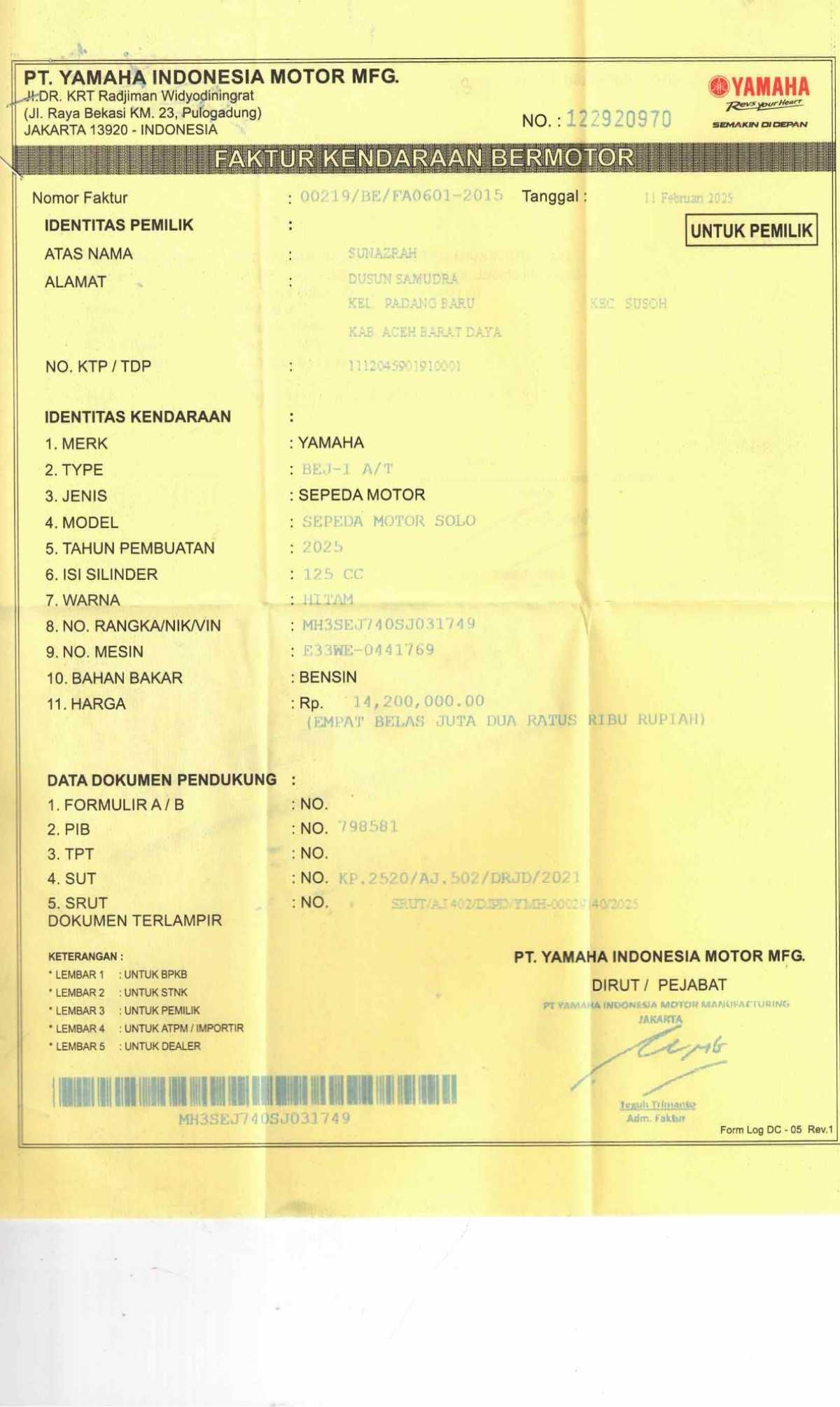 | No. Rangka | : | MH3SEJ740SJ031749 |