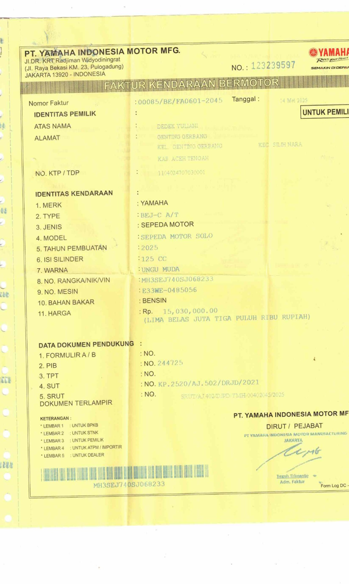 | No. Rangka | : | MH3SEJ740SJ068233 |
