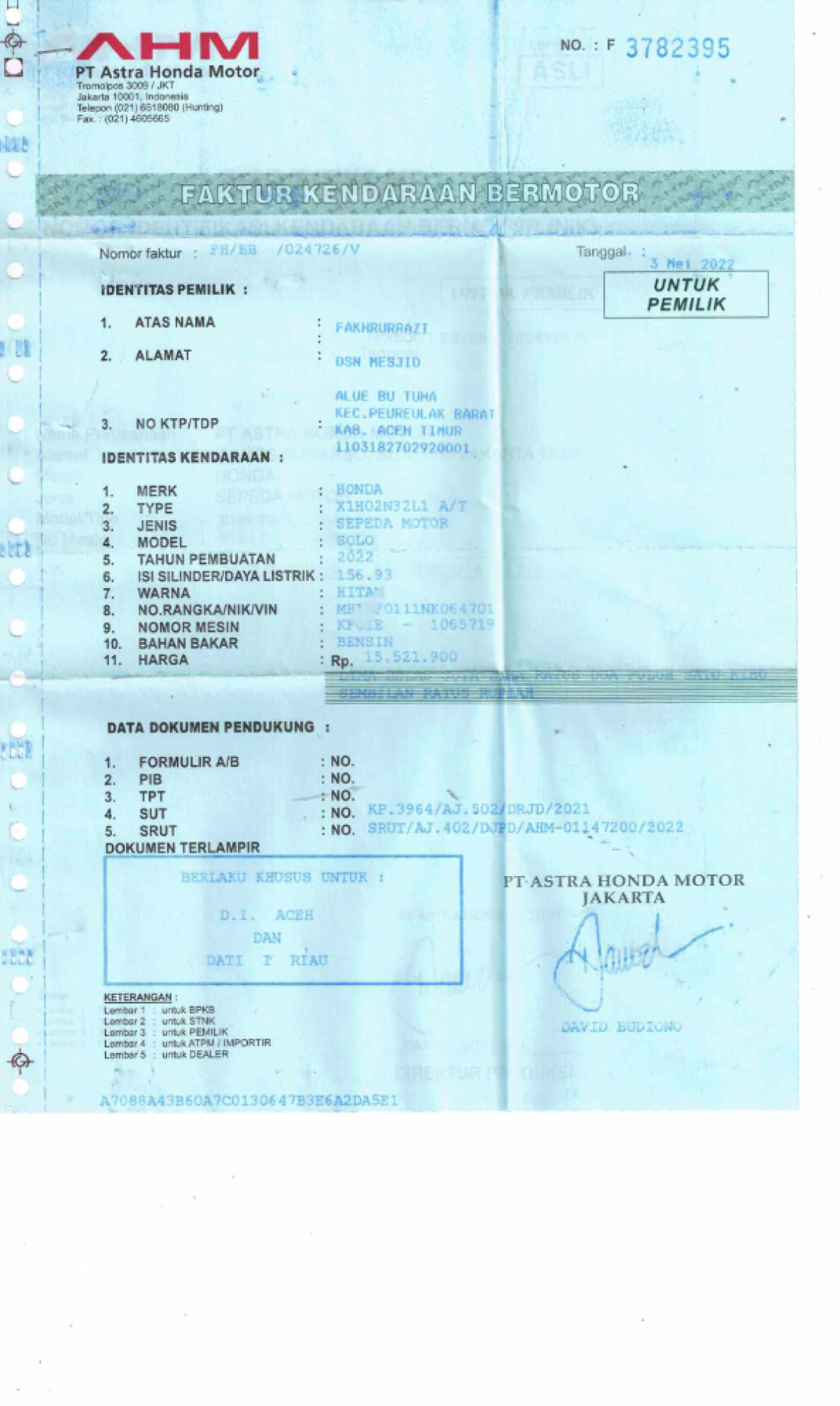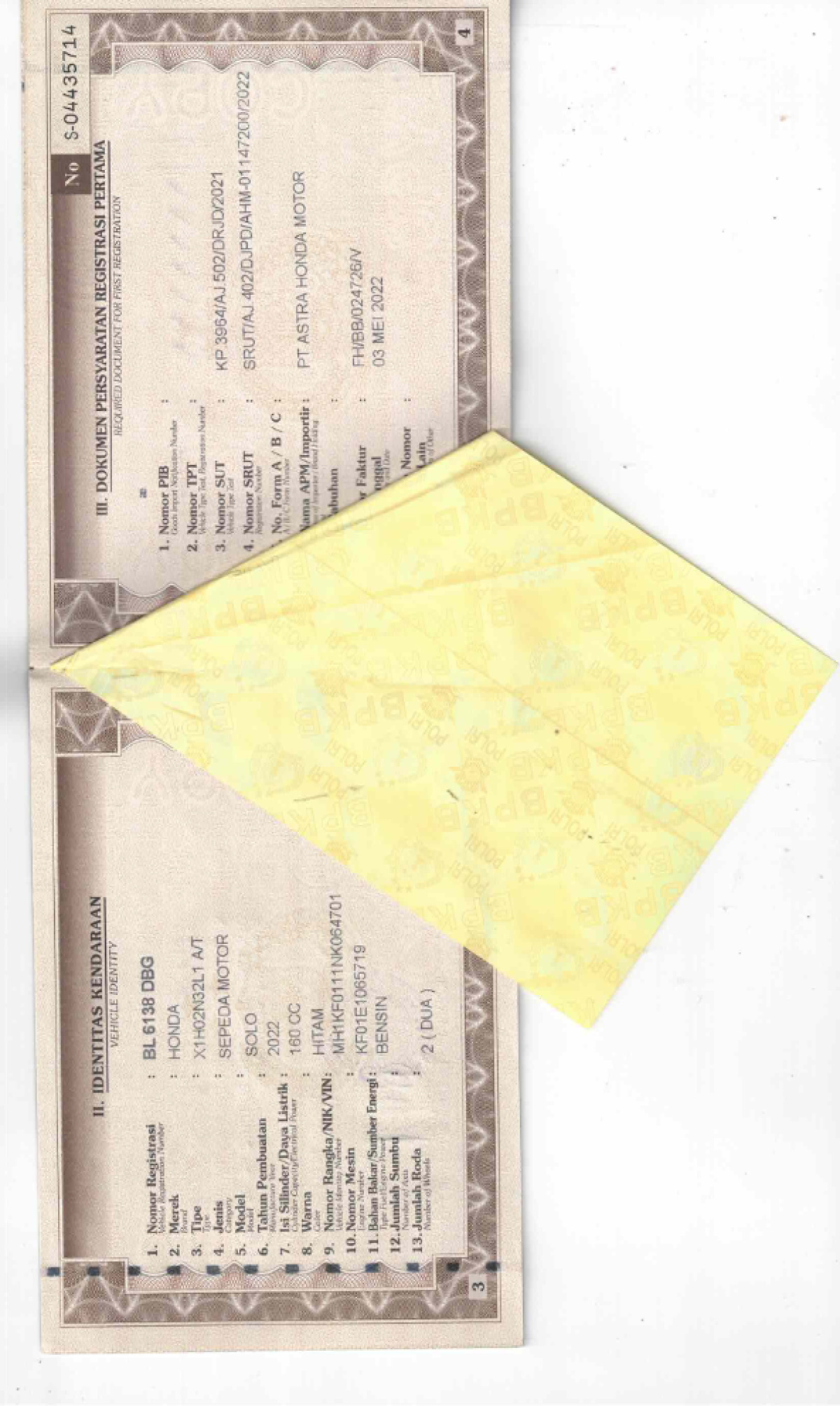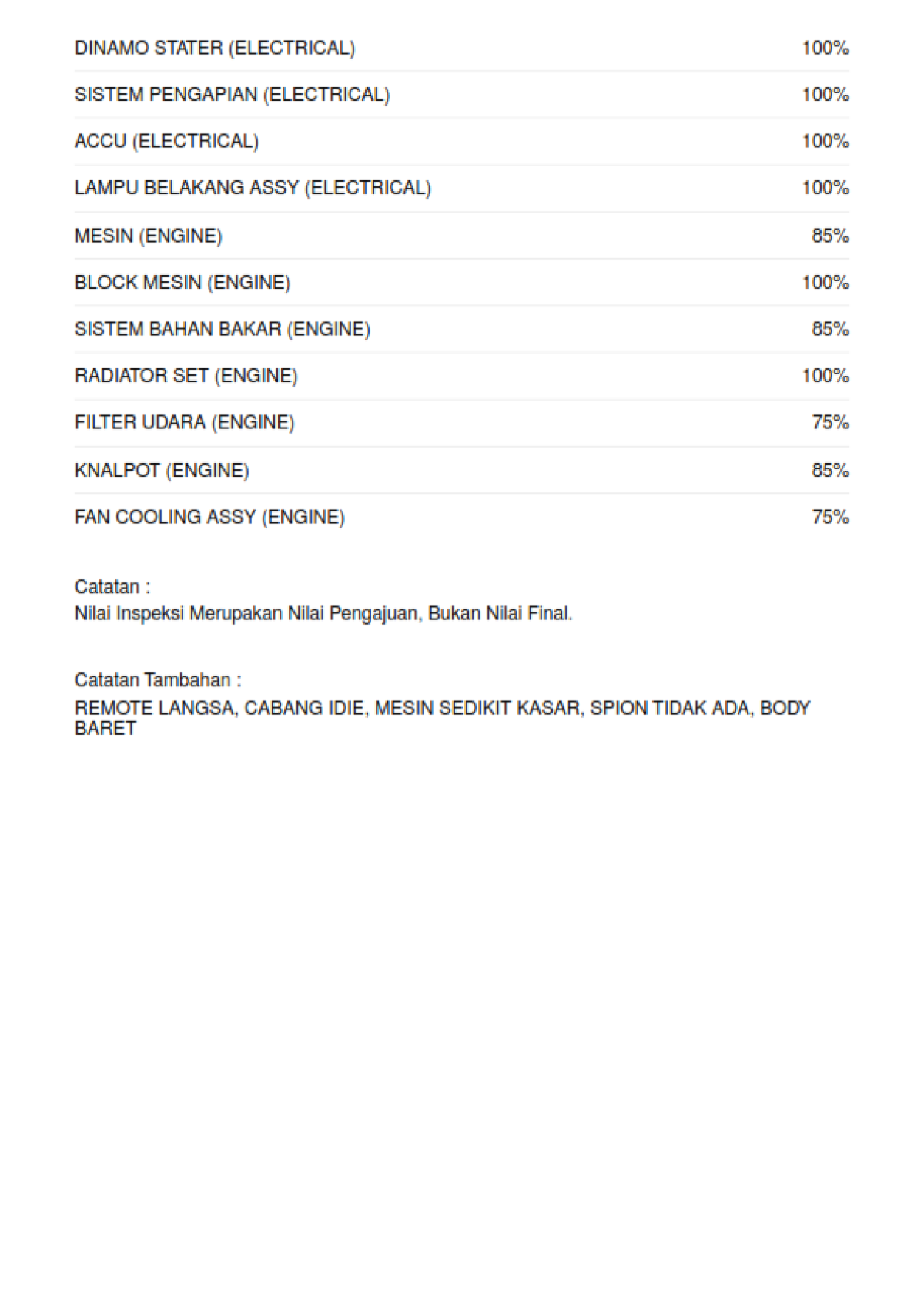 KM 65.776, MESIN SEDIKIT KASAR, SPION TIDAK ADA, BODY BARET// UNIT TIDAK DILAKUKAN PENGECEKAN OLEH TIM SMARTBID// SEBELUM MELAKUKAN PENAWARAN HARAP CEK KONDISI UNIT DAN DOKUMEN TERLEBIH DAHULU// WAJIB MENGHUBUNGI PIC DAN DATANG KE LOKASI UNTUK PENGECEKAN UNIT// UNIT DILELANG APA ADANYA PERMASALAHAN YANG TIMBUL DILUAR TANGGUNG JAWAB SMARTBID// JIKA INGIN MENGAMBIL UNIT HARAP UNTUK KONFIRMASI DAHULU KE SMARTBID // JIKA YANG MENGAMBIL BIDDER HARAP MEMBAWA KTP ASLI// PENGAMBILAN UNIT H+2 HARI KERJA SETELAH PELUNASAN// FOTO NOKA DAN NOSIN TA//