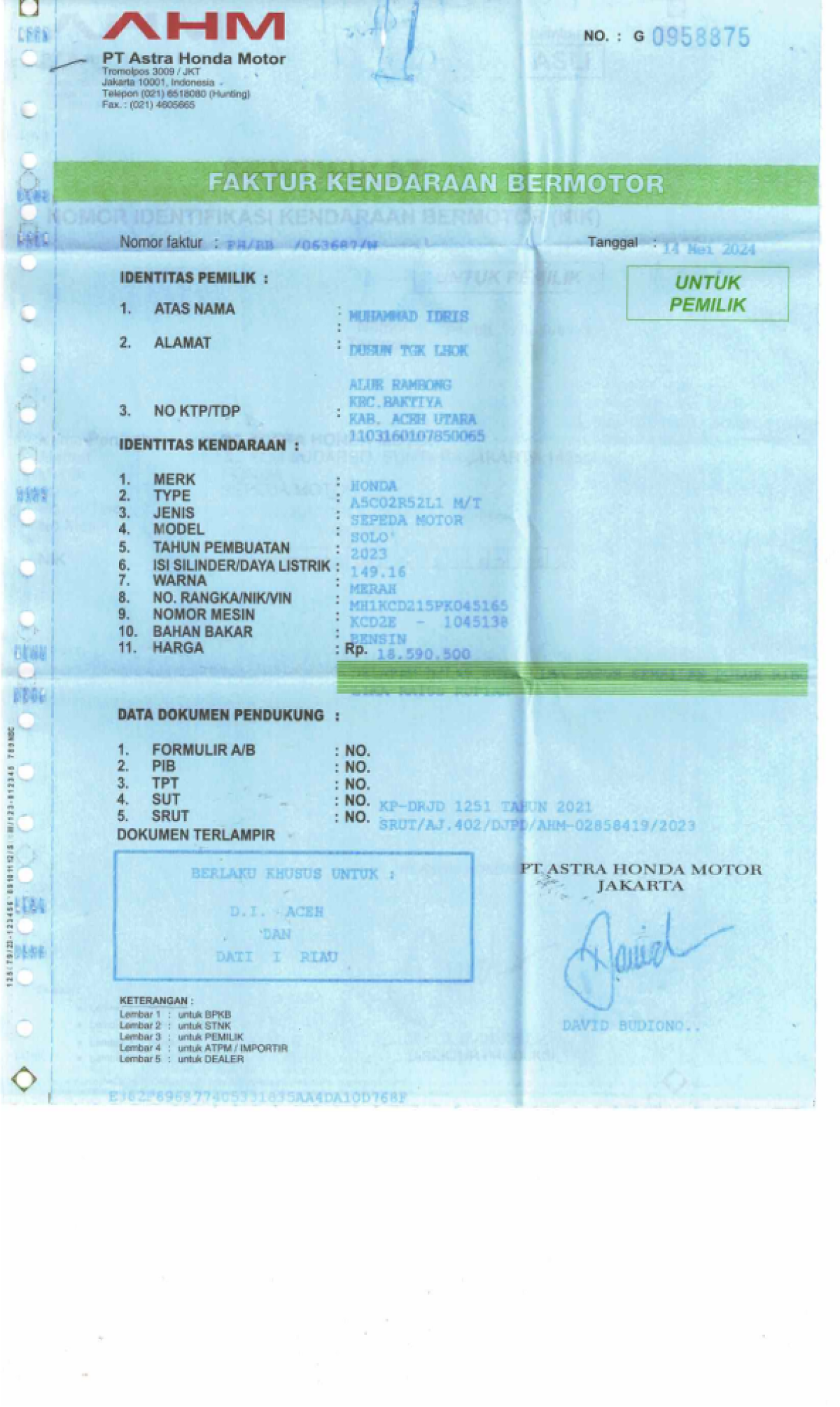 | No. Rangka | : | MH1KCD215PK045165 |