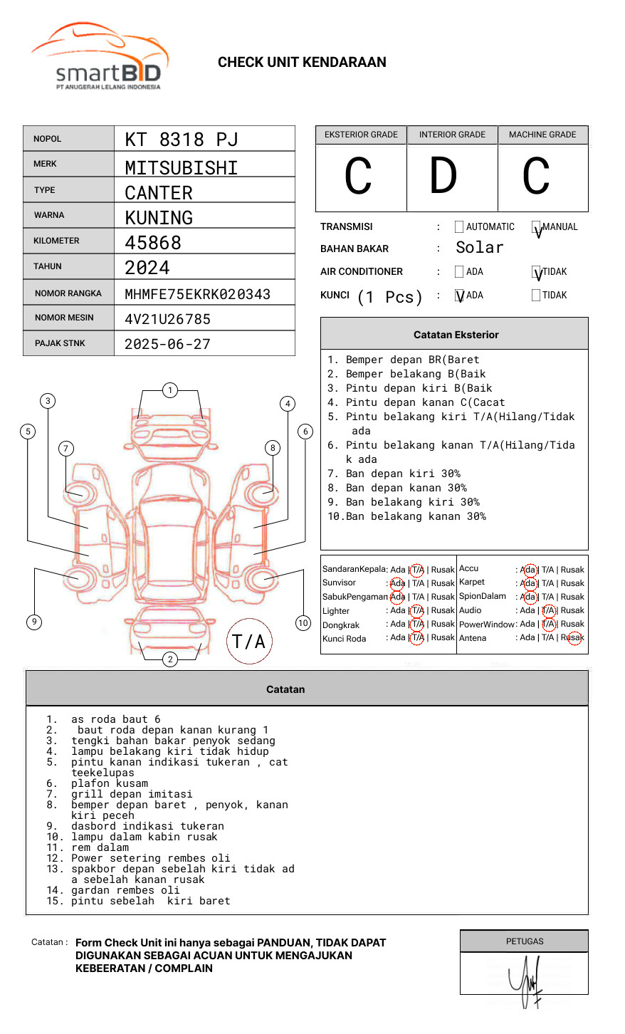 SEBELUM MELAKUKAN PENAWARAN UNIT PESERTA LELANG WAJIB MELAKUKAN PENGECEKAN UNIT DAN DOKUMEN TERLEBIH DAHULU // PIC PUTRA:+62 821-2783-7606 / GUSTI: +62 822-5053-1175 // UNIT DIKENAKAN BIAYA PPN 1.1% DARI HARGA TERBENTUK //
