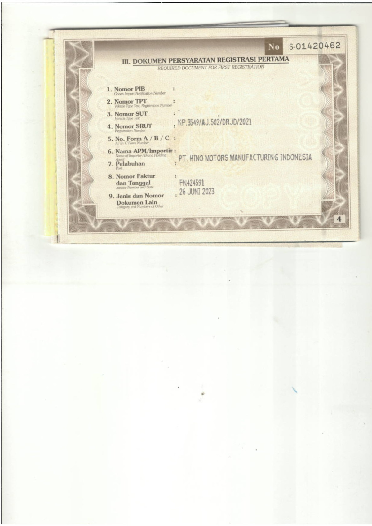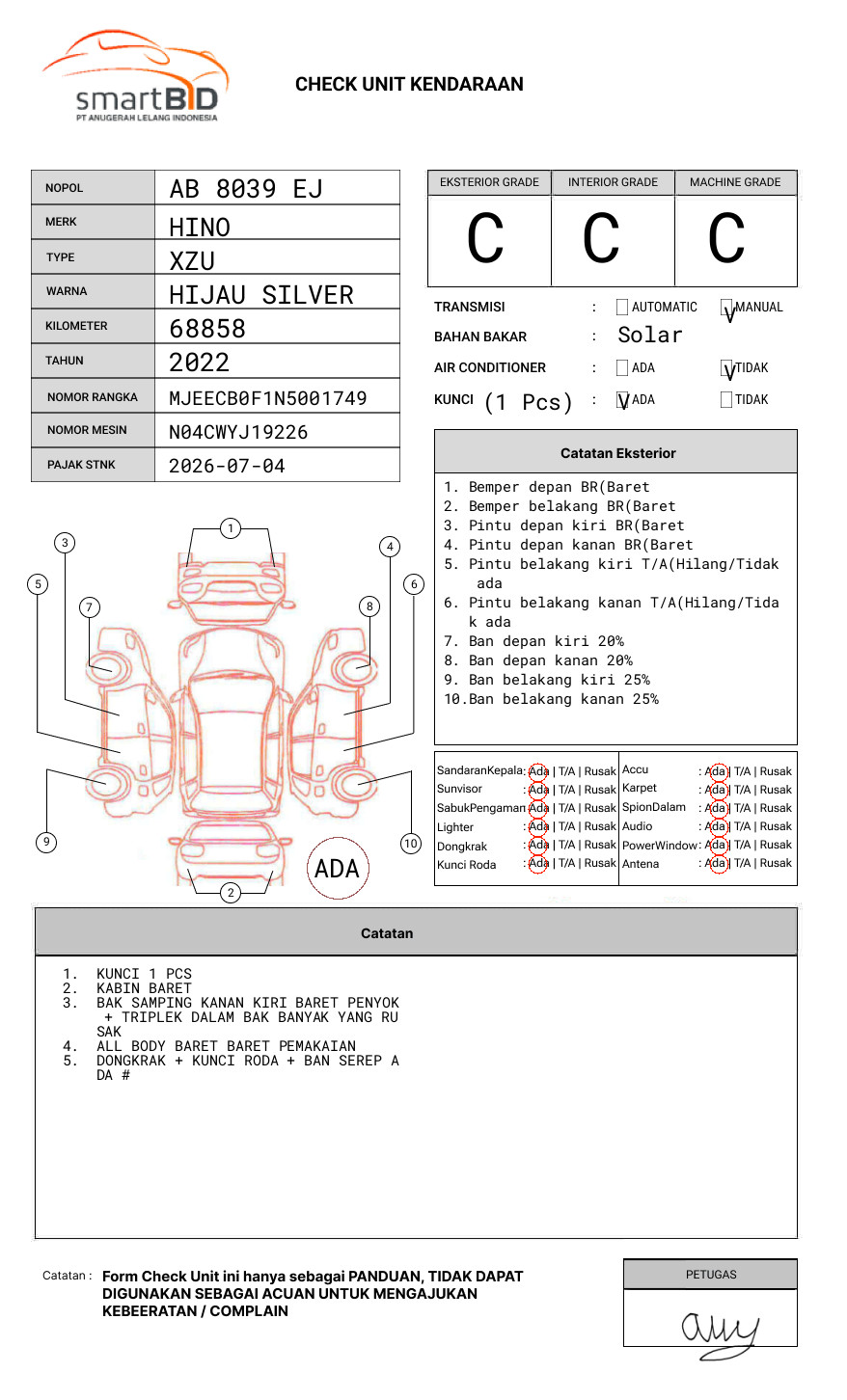 SEBELUM MELAKUKAN PENAWARAN UNIT PESERTA LELANG WAJIB MELAKUKAN PENGECEKAN UNIT DAN DOKUMEN TERLEBIH DAHULU // PIC ARDIAZ 082142028080 // UNIT DIKENAKAN BIAYA PPN 1.1% DARI HARGA TERBENTUK // ADA PERBEDAAN WARNA PADA BPKB & STNK HIJAU SILVER PADA FAKTUR HIJAU // 2DIGIT NOKA BELAKANG TIDAK TERBACA // PEMENANG LELANG WAJIB TTD SURAT PERNYATAAN BERMATERAI DIKASIR //