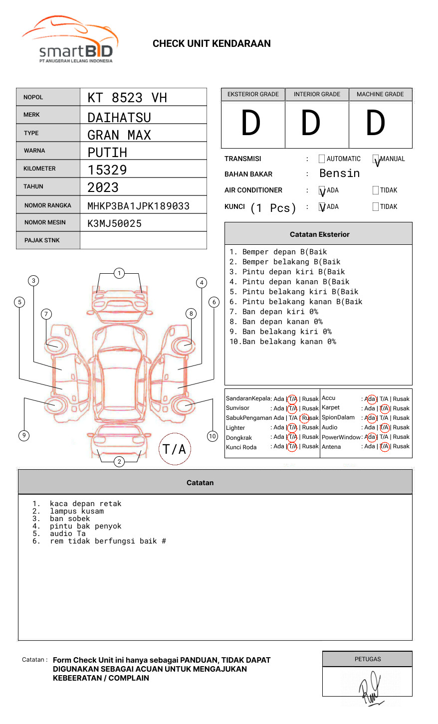 SEBELUM MELAKUKAN PENAWARAN UNIT PESERTA LELANG WAJIB MELAKUKAN PENGECEKAN UNIT DAN DOKUMEN TERLEBIH DAHULU // PIC RESKI 0853-4884-2551 // UNIT DIKENAKAN BIAYA PPN 1.1% DARI HARGA TERBENTUK //UNIT DIKENAKAN BIAYA ROYA FIDUSIA 100.000