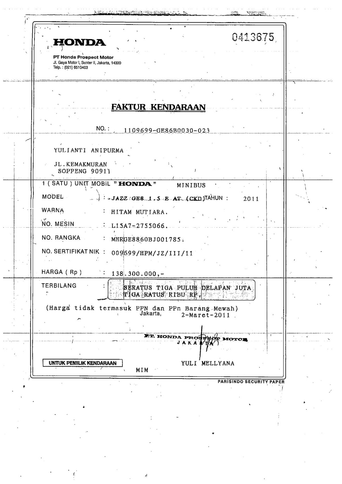 | No. Rangka | : | MHRGE8860BJ001785 |