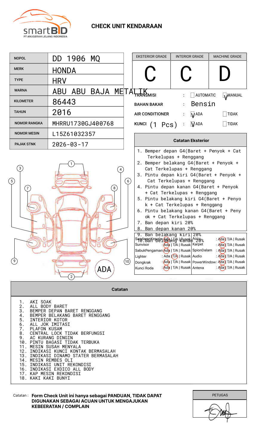 SEBELUM MELAKUKAN PENAWARAN UNIT PESERTA LELANG WAJIB MELAKUKAN PENGECEKAN UNIT DAN DOKUMEN TERLEBIH DAHULU // PIC AHMAD 082345278181 IKRAM 085241587738 // UNIT DIKENAKAN BIAYA PPN 1.1% DARI HARGA TERBENTUK //