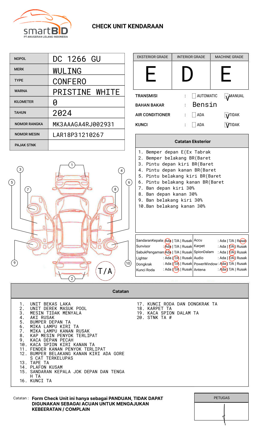 SEBELUM MELAKUKAN PENAWARAN UNIT PESERTA LELANG WAJIB MELAKUKAN PENGECEKAN UNIT DAN DOKUMEN TERLEBIH DAHULU // PIC RUDAL 0821 9140 0425 / MUHAMMAD DARWIS 082348587430 // UNIT DIKENAKAN BIAYA PPN 1.1% DARI HARGA TERBENTUK // ADA BIAYA ROYA FIDUCIA 100,000 DITANGGUNG PEMENANG //