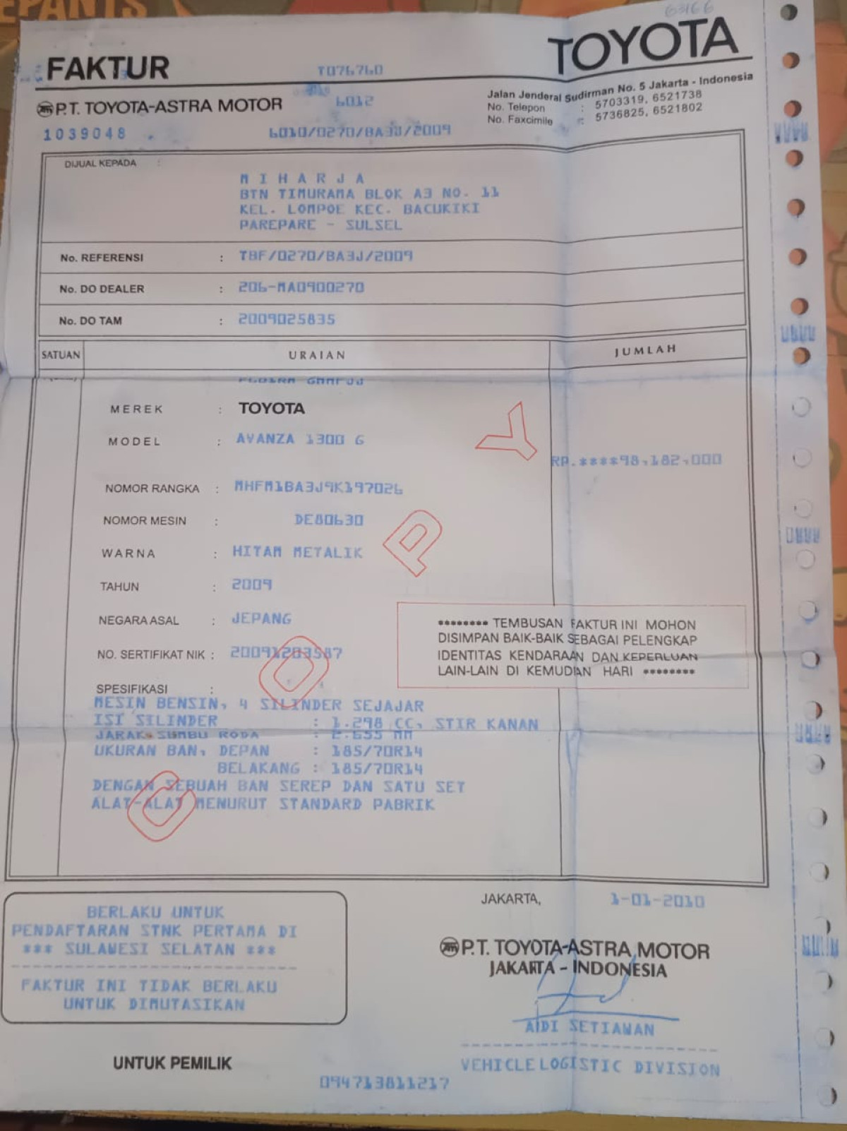 UNIT TIDAK DILAKUKAN PENGECEKAN OLEH TIM SMARTBID// SEBELUM MELAKUKAN PENAWARAN HARAP CEK KONDISI UNIT DAN DOKUMEN TERLEBIH DAHULU// WAJIB MENGHUBUNGI PIC DAN DATANG KE LOKASI UNTUK PENGECEKAN UNIT// UNIT DILELANG APA ADANYA PERMASALAHAN YANG TIMBUL DILUAR TANGGUNG JAWAB SMARTBID// PENGAMBILAN UNIT SLIDE H+2 DARI PELUNASAN // JIKA INGIN MENGAMBIL UNIT HARAP UNTUK KONFIRMASI DAHULU KE SMARTBID // JIKA YANG MENGAMBIL BIDDER HARAP MEMBAWA KTP ASLI // JIKA PENGAMBILAN DIWAKILKAN WAJIB MEMBAWA SURAT KUASA ASLI // UNIT DIKENAKAN BIAYA PPN 1,1% DARI HARGA TERBENTUK// LOKASI UNIT HUBUNGI Bpk. Paul 0823-1581-4593 / CS PUSAT 081188089292// Mesin berfungsi, Body tergores, Ban cadangan tidak ada, Alat mobil tidak ada, Seatbelt belakang tidak ada, Mesin rembes oli//Tire (Fr-L) | Tire (Rr-L) | Tire (Fr-R) | Aircon Evaporator | Rack Steer | Clutch Bearing | Radiator Fan | Engine Services (Light) | Brake Pad (Rr) | Fan Belt | Clutch Plate | Spring (RR) | Coil Ignition | Brake Master | Gasket Cover Head | Remote | Brake Pad (Fr) | Gasket Cylinder Head | Spring (FR) | Tire (Rr-R) | Tire (spare) | Rim (spare) | Battery | Injector | Spark Plug(s)/Carpet Floor (RR) | Carpet Floor (FR-R) | Gear Lever Cover | Interior Saloon | Carpet Floor (Mid) | Carpet Floor (FR-L) | Steering-wheel | Tool Kit | Seatbelt (Rr-L) | Bolt Crane and Jack | Ceiling Lamp (Fr) | Seatbelt (Rr-R) | Ceiling Lamp (Rr) | Carpet | Ceiling Trim/Windshield Wiper | Turn Lamp (Rr-L) | Taillight (Rr-L) | Fog Lamp (L) | Turn Lamp (Rr-R) | Fog Lamp (R ) | Side Skirt Repair (R) | Taillight (Rr-R) | Side Skirt Repair (L) | Mirror (R ) | Roof Repair | Turn Lamp (Fr-R) | Door Repair (Trunk) | Turn Lamp (Fr-L) | Mirror (L) | Fender Repair (Rr-R) | Fender Repair (Rr-L) | Fender Repair (Fr-R) | Bumper Repair (Rr) | Fender Repair (Fr-L) | Bumper Repair (Fr)